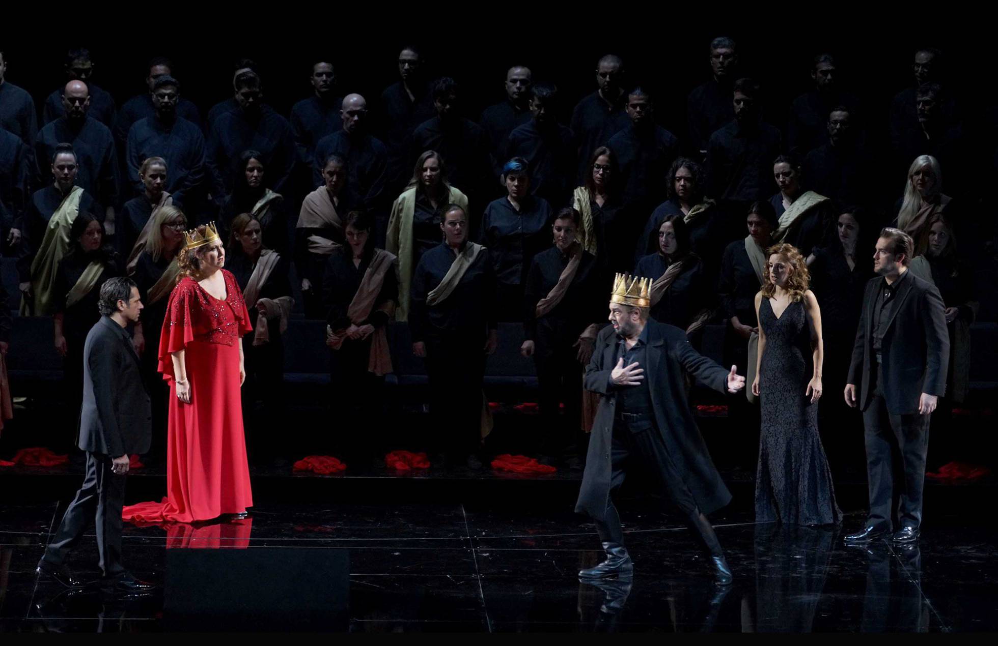La orquesta en el foso, el coro en bancadas y los solistas de negro con el tenor vestido de Macbeth, movimientos escénicos, unas pocas proyecciones en las apariciones fantasmales y apenas unas ficticias coronas y unas espadas como añadido. Más que suficiente. La orquesta y los coros –con la señora del expresidente Zapatero en segunda fila- con sonido global excelente en un trabajo vivo de James Conlon. Sobró quizá la página sinfónica de ballet y hubiera sido mejor aprovechar ese tiempo de ensayo para lograr acentos verdianos más penetrantes en algunos momentos, esos que convierten una buena dirección en magnífica.