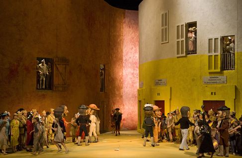 “La Boheme” es quizá el espectáculo más solicitado de la presente edición, no en vano jamás se había representado en el festival. A primera vista sorprende que la producción de Damiano Michieletto sea compartida con el Gran Teatro de Shangay, cuando en China priman las puestas en escena clásicas y espectaculares. Sin embargo su filosofía contiene connotaciones comunes. Las críticas negativas han sido abundantes en la prensa germana y buena parte del público también mostró su desaprobación. La escena elimina mucha de la poesía que intenta sugerir la música y ni siquiera el texto es respetado en el tercer acto, ubicándolo en medio de una autopista por la que afortunadamente no transita vehículo alguno. Un tenderete para refrigerios en la cuneta es cuanto hay hasta que los semáforos son sustituidos por un enorme decorado de fondo consistente en la página de un callejero delante de la que se interpreta el conocido cuarteto. Los protagonistas son desahuciados de su buhardilla y se han de mudar para el cuarto acto debajo de un puente con todas sus pertenencias embaladas, bombona de butano incluida. Así Mimí muere convertida en homeless. Unos trazos finales, escritos por unos dedos anónimos con su nombre en un gran cristal empañado trasero y borrados por la mano entera tras su óbito, intentan trasladar emoción al espectador, que ha visto toda la historia desde el alféizar de una monumental ventana. La lágrima llega porque la Filarmónica de Viena suena maravillosamente bajo la experta batuta de Gatti, porque la música es la que es y porque, a pesar de todo, algo acaba por funcionar en el escenario. El regreso de Anna Netrebko tras su aclamada “Traviata” era esperado con expectación, pero la producción no le hace justicia. Pasen los tatuajes en cuello y brazo de la costurera o los demás aditamentos propios de un París menos que mileurista del XXI, pero el vestuario acaba por destrozar la figura que perdió tras su maternidad. Afortunadamente no es que cante igual que antes, sino todavía mejor, puesto que la voz ha ensanchado tanto como su cintura y se ajusta perfectamente a las exigencias de un papel que aborda desde la madurez artística. Casi a la altura de las Freni y Cotrubas. Piotr Beczala justifica el primerísimo lugar que ocupa en el repertorio e tenor lírico-ligero, si bien el tercer acto le queda un punto central, y Nino Machaidze da perfecta réplica a Museta. Curioso que los tres grandes triunfadores en una “Boheme” sean una rusa, un polaco y una georgiana, porque los italianos Cavalletti y Colombara no brillan a la misma altura. Dato adicional: precios de70 a400€.