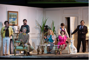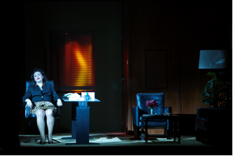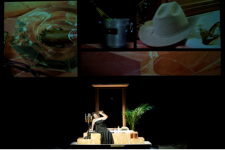 Tiene, sin embargo, la producción aspectos positivos, especialmente en forma de una escenografía (también de Julia Hansen) a base pequeños módulos, que permiten rápidos cambios de escena a la vista, lo que da un buen ritmo a la acción. A esto habría que añadir el hecho de que los módulos escénicos (como si de platós de televisión se tratara) se colocan siempre en el frente del escenario, lo que ayuda a que las voces lleguen en buenas condiciones a la sala. El escenario siempre tiene dos niveles: el inferior, donde se desarrolla la acción en los distintos módulos (oficina, sala de reuniones, baño, terraza, restaurante de club de tenis), mientras que en la parte superior hay una pantalla, donde se proyectan videos alusivos a la acción, que tiene como mayor inconveniente el de ofrecernos invariablemente imágenes de los personajes interpretados por los artistas que estrenaron la producción en Gante. La iluminación de Bernd Purkrabek no es particularmente brillante. La aparición final de Juno no es sino la de una ayudante de dirección, que entrega a los actores el guión para él próximo capítulo de la serie.