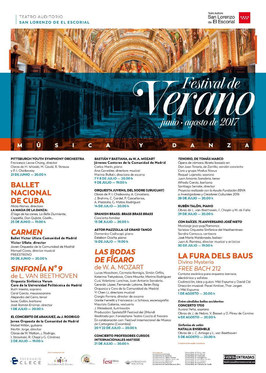 El Festival de Verano de San Lorenzo de El Escorial arranca el próximo 21 de junio con una variada selección de espectáculos. Consolidado como uno de los principales festivales de nuestro país, la música, la lírica y la danza llenarán las noches de la sierra madrileña del 21 de junio al 5 de agosto. La9ª Sinfonía de Beethoven, el preestreno de Carmen del Víctor Ullate Ballet Comunidad de Madrid y el Ballet Nacional de Cuba, Las bodas de Figaro y la Fura dels Baus, son algunos de los protagonistas de los 17 espectáculos y conciertos de esta nueva edición.