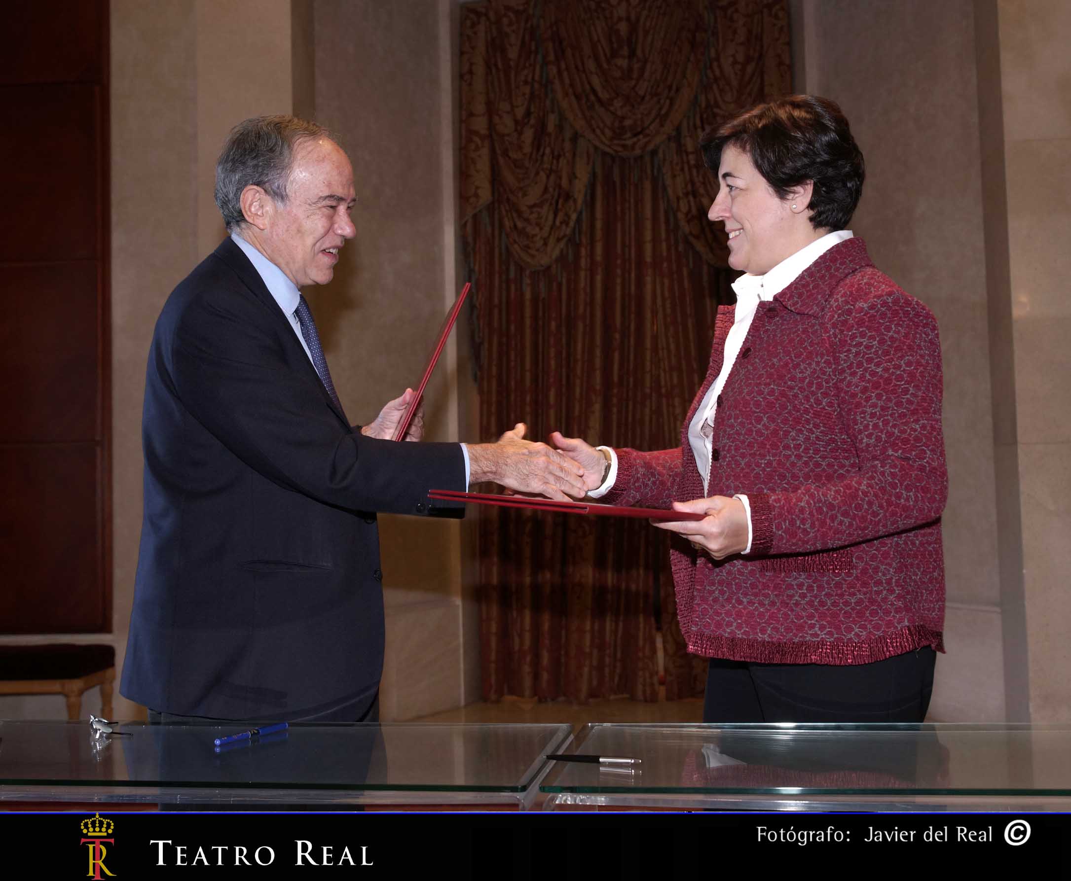 Madrid. 19 de noviembre.- El Teatro Real e Hispasat, operador español de satélites de telecomunicaciones líder en la distribución de contenidos en español y portugués, han firmado un convenio de colaboración en la mañana de hoy, que permitirá impulsar las retransmisiones en directo, vía satélite, de espectáculos del Teatro Real tanto en el ámbito nacional como internacional.