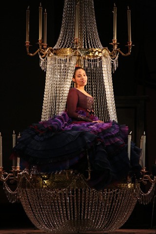 El espectáculo escénico ofrecido es una nueva producción de Frederic Wake-Walker, que hacia su debut en La Scala. El espectáculo comienza con buenas expectativas, al ofrecer durante la obertura la colocación de los elementos escénicos por parte de unas atractivas figurantes vestidas de negro, que luego reaparecen en diversos momentos, aunque no se sepa bien qué pintan por ahí, aparte de utilizar unas maderas para figurar el ruido de los tortazos que en diversas ocasiones ofrece la ópera. La escenografía es obra de Anthony McDonald, ofreciendo un reducido espacio para el primer acto, en el que no están muy bien conseguidos los escondites del Conde y de Cherubino. Más elegante es la habitación de la Condesa en el acto II, aunque los escondites de Susanna y Cherubino no son sino un enorme armario, sobre el que me pregunto cómo utilizar la parte superior, cuando el mueble tiene unos 5 metros de altura. No está bien resuelta la huida de Cherubino por la ventana, ya que por ahí mismo sale Fígaro al principio del acto y sin necesidad de saltar.