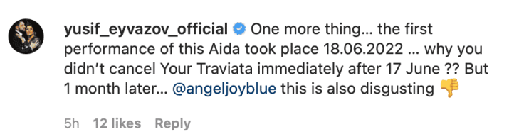 Apenas unas horas después de la publicación de Angel Blue, Yusif Eyvazov, pareja de Anna Netreko, contestó a la soprano: “Y una cosa más… la primera función de Aida fue el 18 de junio… ¿por qué no canceló inmediatamente después del día 17 en vez de un mes después? Angel Blue, esto es también asqueroso”.