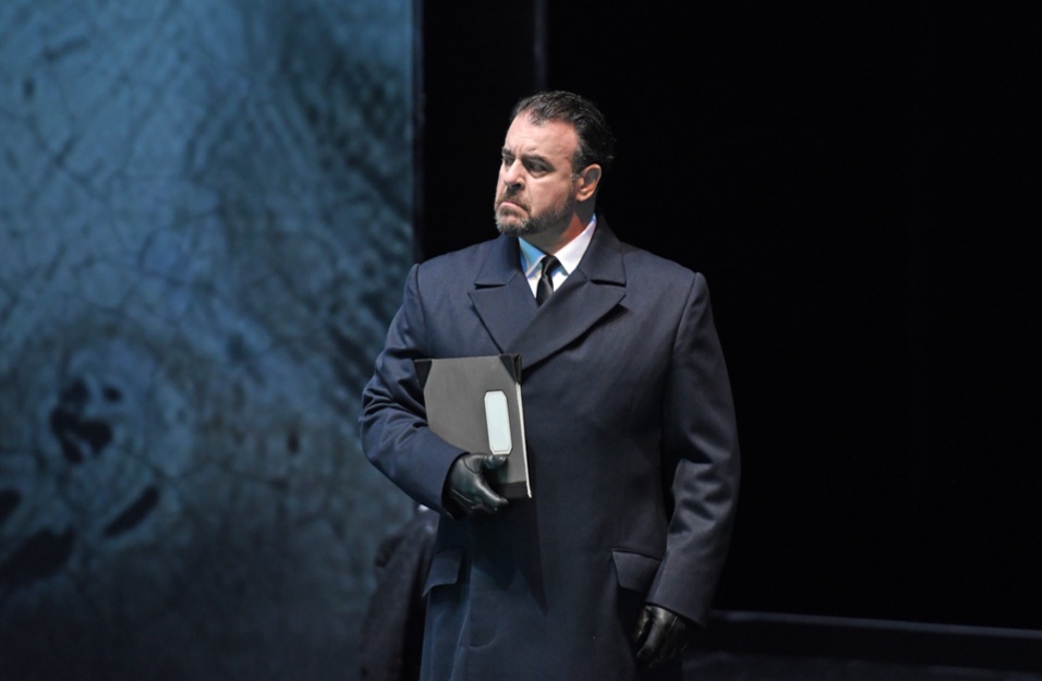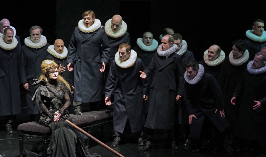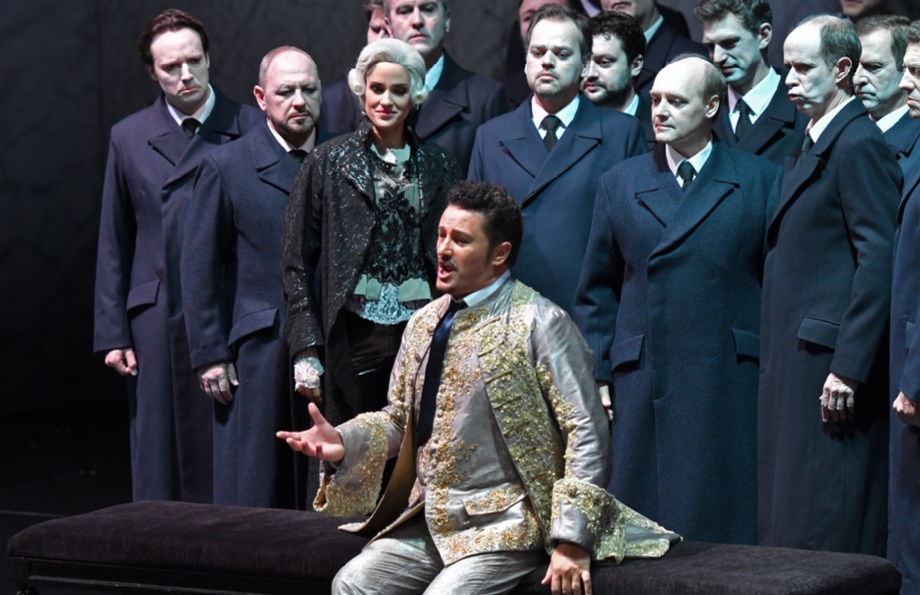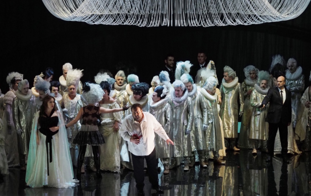 La producción lleva la firma de Vincent Boussard, siendo coproducción con la Ópera de Nürnberg, y su resultado es tan anodino y plano como suelen ser casi todos los suyos. El director de escena francés suele presentar como un activo importante la presencia de Christian Lacroix como figurinista, pero se me antoja insuficiente. Estamos ante una producción minimalista con escenografía de Vincent Lemaire, que desarrolla casi toda la acción en un escenario único, con tres paredes cerradas, añadiendo algunos escasos elementos de atrezzo para intentar cambiar la atmósfera de cada escena. Únicamente, resulta algo diferente la escena del Baile de Máscaras, en el que hay luz, vestuario colorista y una gran lámpara. El ambiente oscuro, salvo la escena final, no está suficientemente aprovechado por el responsable de iluminación, Guido Levi.