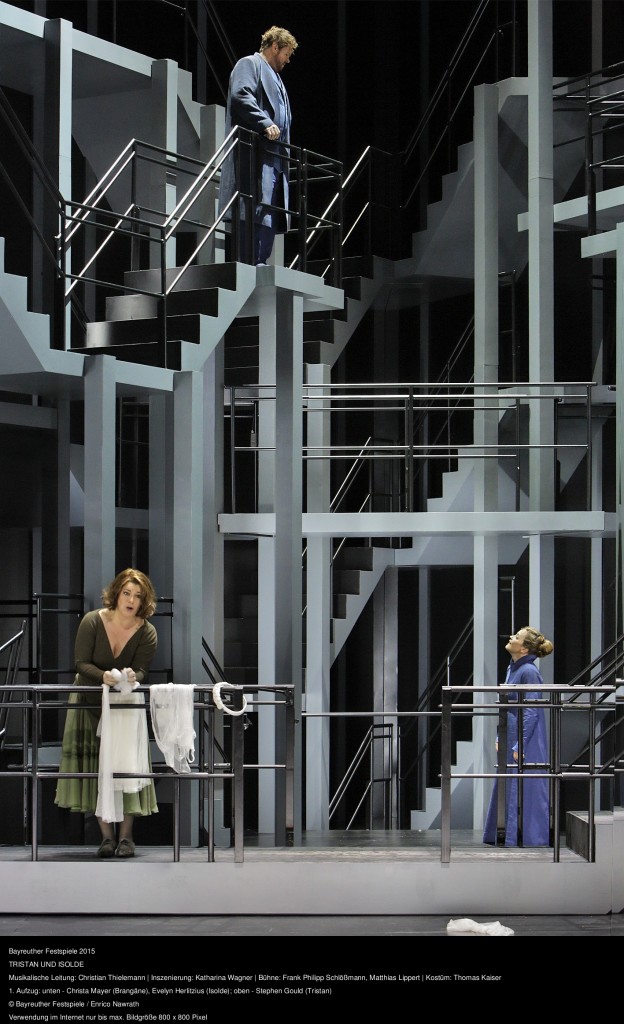 TRISTAN E ISOLDA, de Richard Wagner. Ópera en tres actos, con libreto de Wagner. Reparto: Stephen Gould (Tristan), Evelyn Herlitzius (Isolda), Iain Paterson (Kurwenal), Christa Mayer (Brangäne), Georg Zeppenfeld (Rey Marke), Raimund Nolte (Melot), Tansel Akzeybek (Joven mariner. Un pastor), Kay Stiefermann (Timonel). Directora de escena: Katharina Wagner. Escenografía: Frank Philipp Schlößmann y Matthias Lippert. Vestuario: Thomas Kaiser. Dramaturgia: Daniel Weber. Iluminación: Reinhard Traub. Coro y Orquesta titulares del Festival de Bayreuth. Dirección de coro: Eberhard Friedrich. Dirección musical: Christian Thielemann. Lugar: Festspielhaus de Bayreuth. Entrada: 1974 espectadores (lleno). Fecha: Viernes, 7 de agosto de 2015.