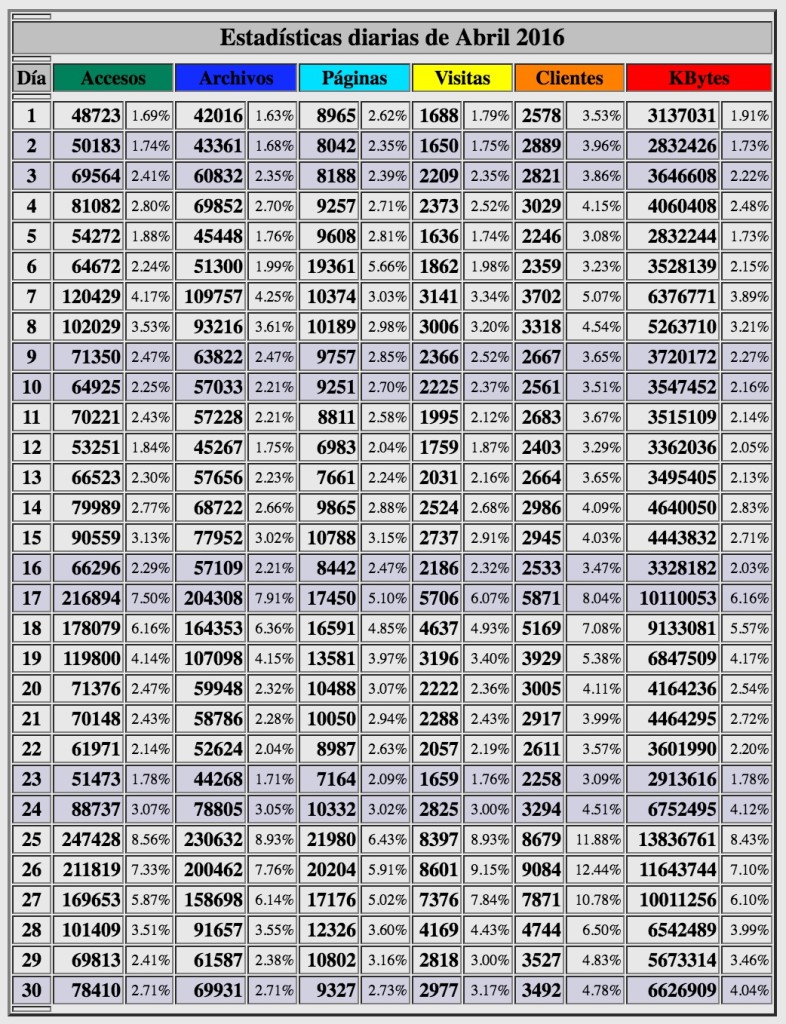 Más de 53.000 visitas y 230.000 páginas es lo que muestra el contador de Beckmesser en los primeros veinte días de abril. En concreto el día 17 se alcanzaron los 5.700 visitantes únicos y 4.700 el día 18. Esto es tanto como llenar un día más de tres veces el Teatro Real y al día siguiente el Metropolitan neoyorquino. Si es raro que una publicación musical comunique sus difusiones, Beckmesser es la única que abiertamente publica su contador y sus cifras siempre se hallan muy por encima de esas pocas que se comunican sin pruebas.