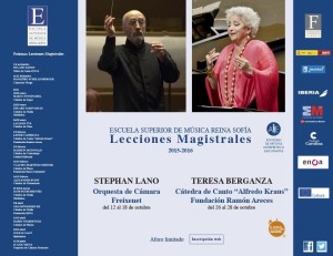 El ciclo de Lecciones Magistrales comienza con Teresa Berganza, Departamento de Canto “Alfredo Kraus” Fundación Ramón Areces, entre el 26 y 28 de octubre. La mezzo-soprano madrileña, artista universal tan querida y admirada por el público, entró desde muy temprana edad a estudiar en el Conservatorio de Madrid por influencia de su padre. Ha actuado bajo la batuta de los directores más importantes del siglo XX y de la actualidad: Carlos Maria Giulini, Nicola Rescigno, Herbert Von Karajan, Georg Solti, Zubin Mehta, Claudio Abbado, Daniel Baremboim, Riccardo Muti y Samuel Hans Adler, entre otros.