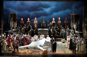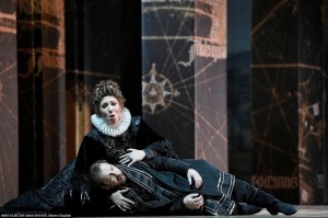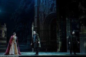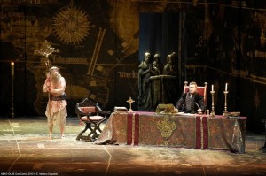 Hace ahora 5 años ABAO representó Don Carlo en su versión italiana y en 4 actos. Ahora se hace con la versión original y la producción vuelve a ser la misma que en aquella ocasión. Simplemente, se añade el acto De Fontainebleau, con un escenario muy simple que ofrece una especie de arbolillos y un ciclorama al fondo. En todo lo demás, estamos en la producción de hace 5 años. La producción escénica lleva la firma de Giancarlo del Monaco El trabajo de Del Mónaco es elegante, clásico y muy fiel al libreto, salvo en el desenlace final del drama, que termina con la muerte de Don Carlo a manos de Felipe II, lo que no deja de ser un capricho sin base histórica, musical ni literaria. La figura del emperador Carlos V está presente, como lo está El Escorial, más allá de que parte de la acción se desarrolle en dicho Monasterio. Ya el telón de la producción ofrece un fragmento de un mural de la Batalla de Mühlberg, seguramente reproducción de los de Alba de Tormes. En las escenas de El Escorial está presente la famosa escultura de Carlos V y el Furor, de los Leoni padre e hijo, que se puede ver en el Museo del Prado. Por último, en el Auto Da Fe el pueblo saca en andas una enorme reproducción del famoso Cristo Crucificado de Benvenuto Cellini, que se puede ver en la Basílica del Escorial. A todo esto tendremos que añadir que en los aposentos de Felipe II las paredes representan mapas antiguos de las grandes posesiones imperiales españolas en el mundo. El trabajo de decoración de Carlo Centolavigna resulta un buen complemento a la idea de Del Mónaco sobre el desarrollo escénico del drama. El vestuario de Jesús Ruiz es atractivo y rico, en tonos oscuros para los cortesanos y claros para el pueblo. La iluminación de Wolgang Von Zoubeck, colaborador muy habitual en las producciones de Del Monaco, no esta a la altura de lo que hemos podido disfrutar en otras ocasiones.
