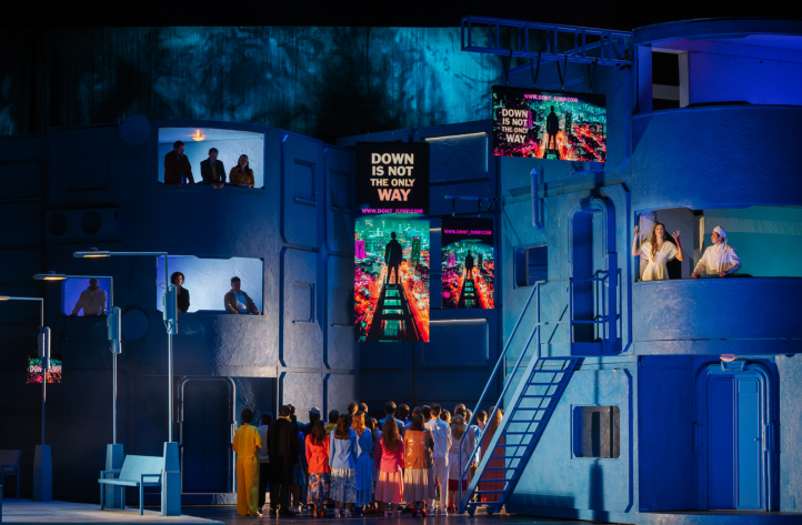 En Budapest, esta producción de András Almási-Tóth, estrenada en un 2023 y repuesta ahora, se convierte en una distopía moderna, intentando situar el drama mozartiano en un contexto más o menos contemporáneo marcado por referencias visuales a la tecnología y la crisis social, aunque esta actualización no nos parece que acabe logrando siempre un equilibrio satisfactorio entre lo escénico y lo musical. La puesta en escena introduce elementos como cámaras y pantallas que transmiten en directo, un recurso que no siempre es necesario, distraen del núcleo dramático.