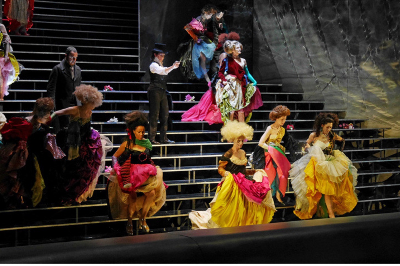 Esta producción siempre me ha parecido pretenciosa, caprichosa y cara, además de aburrida. La escenografía de Vincent Lemaire responde a un concepto minimalista, con unas paredes pintadas con motivos difusos, ofreciendo como únicos elementos de atrezzo un lavabo en la habitación de Giulietta y una serie de sillas de montar colgadas del techo en la primera escena. Se me ocurren decenas de óperas a las que se puede aplicar esta escenografía. En algunas escenas aparece todo el escenario con una gran escalera, pero eso no es sino un capricho del director de escena, que ha elegido como responsable del vestuario a Christian Lacroix, que tiene que lucir sus modelos en un absurdo desfile en la gran escalera en el inicio del segundo acto. El vestuario del afamado figurinista tiene que ver con esta ópera como con cualquier otra. Parece que los centenares de metros de tejidos que gasta en vestir a las figurantes se le acaban al llegar a la pobre Giulietta, a la que le deja en un corsé con pompones por debajo. La iluminación de Guido Levi es lo que mejor funciona de toda la producción.