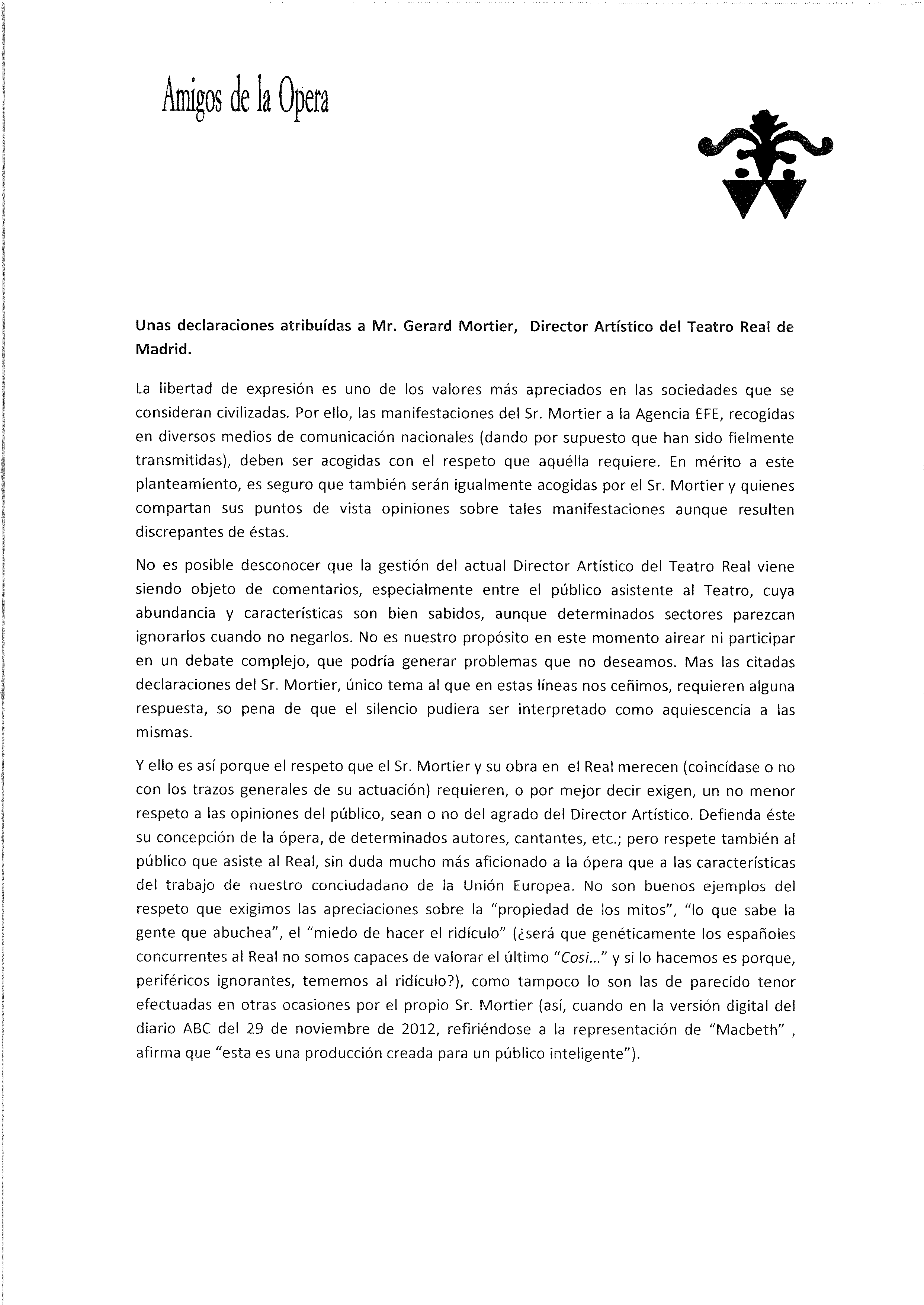 He aquí la carta enviada por los Amigos de la Ópera de Madrid sobre las últimas declaraciones de Mortier en relación al público español.