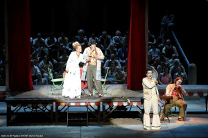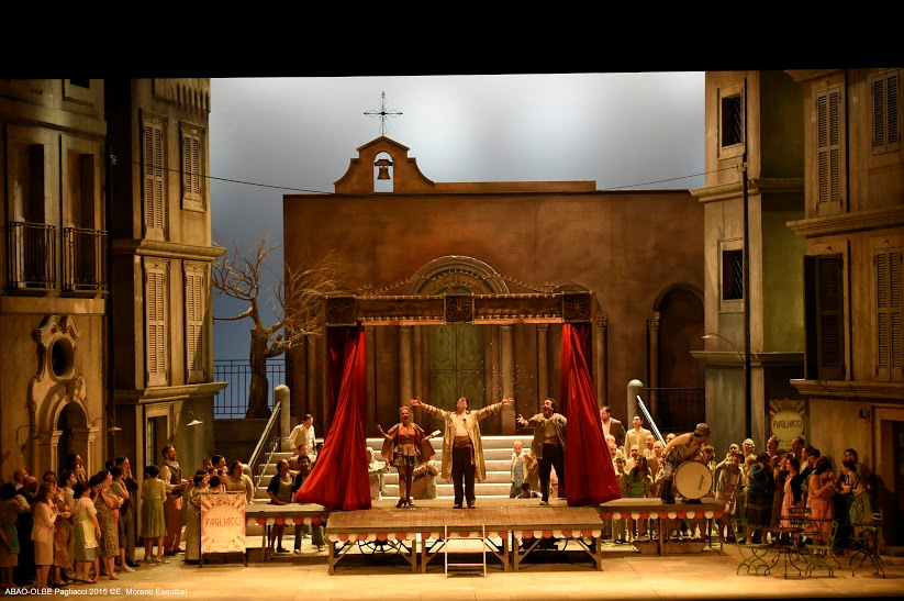 La producción escénica de Joan Antón Rechi se ofrece como pura continuación dramática de Cavallería Rusticana. De hecho, en el preludio que precede al Prólogo, vemos a Santuzza con un bebé en brazos, para, a continuación, verla de nuevo despidiéndose de su hijo ya adolescente, que no es otro que Canio, a quien ella acabará consolando en los compases finales de la ópera. La escenografía de Gabriele Moreschi es exactamente la misma que en Cavallería, con el añadido de un carromato, donde llega la trouppe circense y donde se desarrollará la supuesta Commedia dell’ arte. El vestuario de Mercè Paloma sigue siendo el mismo que en la entrega anterior y la iluminación de Bogumil Palewicz resulta algo más discreta que en la ópera de