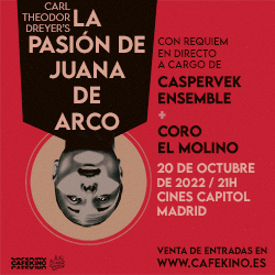 El Cine Capitol de Gran Vía acoge el jueves 20 de octubre una nueva sesión de cine mudo con banda sonora en directo de Café Kino, que en esta ocasión presenta el hito cinematográfico de Carl Theodor Dreyer: La Passion de Jeanne d’Arc (1928). La cinta, encumbrada como un título emblemático en la historia del cine, se basa en la documentación auténtica del juicio de Juana de Arco, que Dreyer relata utilizando primeros planos, haciendo énfasis en la expresión de los actores, para destacar la crudeza del encierro de la Doncella de Orleans, cautivada y ejecutada por los ingleses.