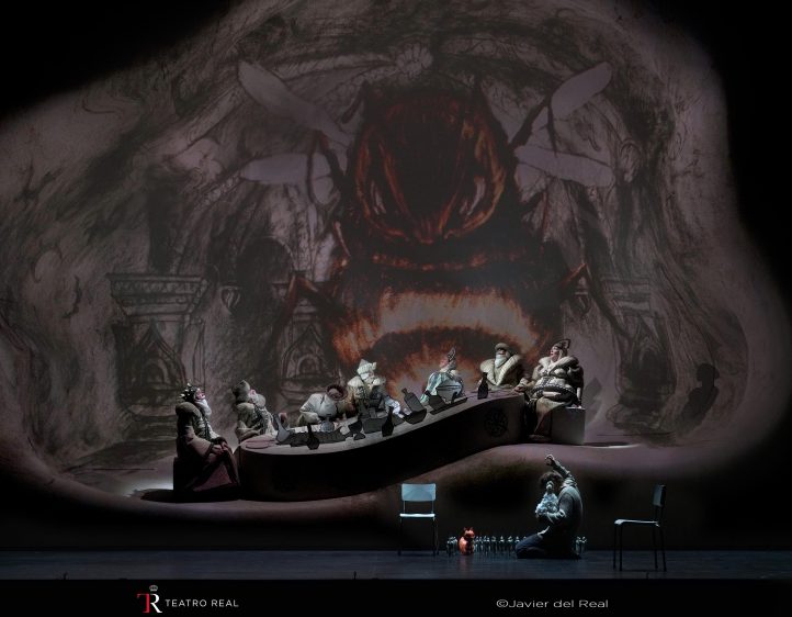 Claus Guth propuso un montaje conceptualmente cargado de sus propios estilemas: la casa pivotante, los fantasmas del inconsciente, el reinado de los sosias; todas propuestas que hemos visto en mayor o menor grado de desarrollo en otros trabajos suyos como Rodelinda u Orlando. La novedad residió en cómo de elaborado está en Mitridate el espacio del subconsciente, la complejidad de ese semicirco onírico repleto de agujeros donde los remordimientos y los dobles de los protagonistas construyen un correlato aterrador.