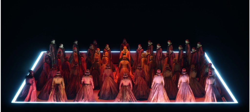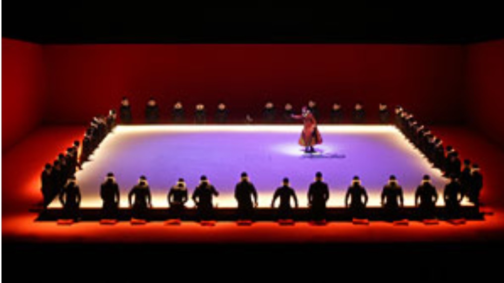 Pude ver la producción hace 8 años en Madrid y me pareció un trabajo minimalista, dominado por una gran plataforma, movida hidráulicamente, y una gran escalera en la casa de Rigoletto. La producción entonces no me convenció, llamando la atención la labor del coro como testigo mudo, como si de una tragedia griega se tratara.