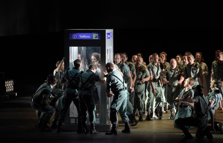 Se trata de la producción de Calixto Bieito, que es indudablemente la más exitosa a nivel popular de cuantas ha hecho el director de escena burgalés. Es la producción que se estrenara en el Festival de Peralada en 1999 y que luego viajó bastante por Europa. En una concepción minimalista traslada la acción a tiempos modernos – posiblemente años 70/80 del siglo pasado -, lo que resulta perfectamente adecuado, pues no hay que olvidar que el personaje de Carmen finalmente no es sino un mito y estos son intemporales.