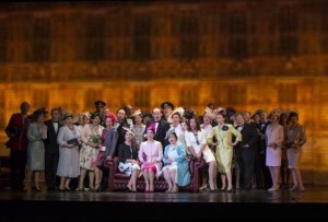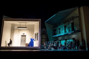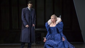 El Covent Garden ha ofrecido una nueva producción escénica, que lleva la firma de Moshe Leiser y Patrice Caurier, que es la que se verá en unos meses en Barcelona. Para mí es el peor trabajo escénico que he visto de esta pareja de registas, que siempre me han parecido unos muy interesantes directores de escena. La escenografía de Christian Fenouillat ofrece una primera escena con una tela al fondo que parece ser el parlamento británico, con unas butacas por delante y un atril o podio para la primera intervención de la reina. A partir de esta primera escena nos vamos a Forteringa, donde transcurre todo el resto de la ópera en lo que parece ser un patio de prisión. El vestuario de Agostino Cavalca no puede ser más confuso, puesto que todos los personajes visten ropas actuales, mientras que las dos reinas van vestidas con pesados ropajes de la época histórica del drama. Algún sentido tendrá este galimatías, aunque no se me alcanza sino que quieran significar sus autores que la monarquía es algo anticuado y fuera de lugar, que no ha sido capaz de evolucionar. La iluminación de Christophe Forey no saca demasiado partido a las posibilidades que ofrece la prisión.
