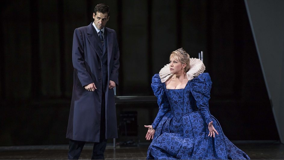 Aparte de la mezcla de épocas y el poco atractivo escénico de la producción, la dirección escénica de Leiser y Caurier tampoco tiene interés, con escaso movimiento de masas y una ramplona dirección de actores, en la que no faltan detalles absurdos, como el afán de la Reina de Inglaterra por desnudar en escena a Leicester.