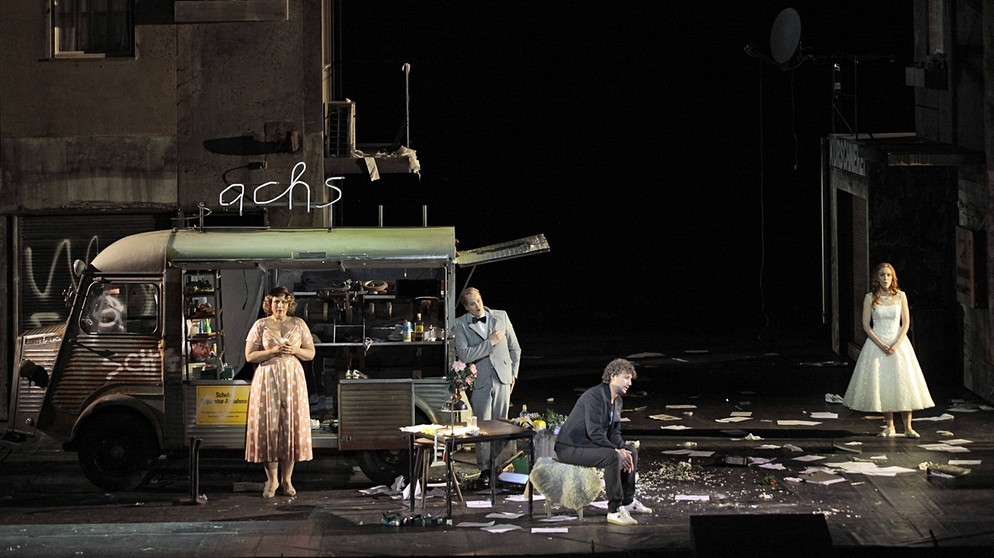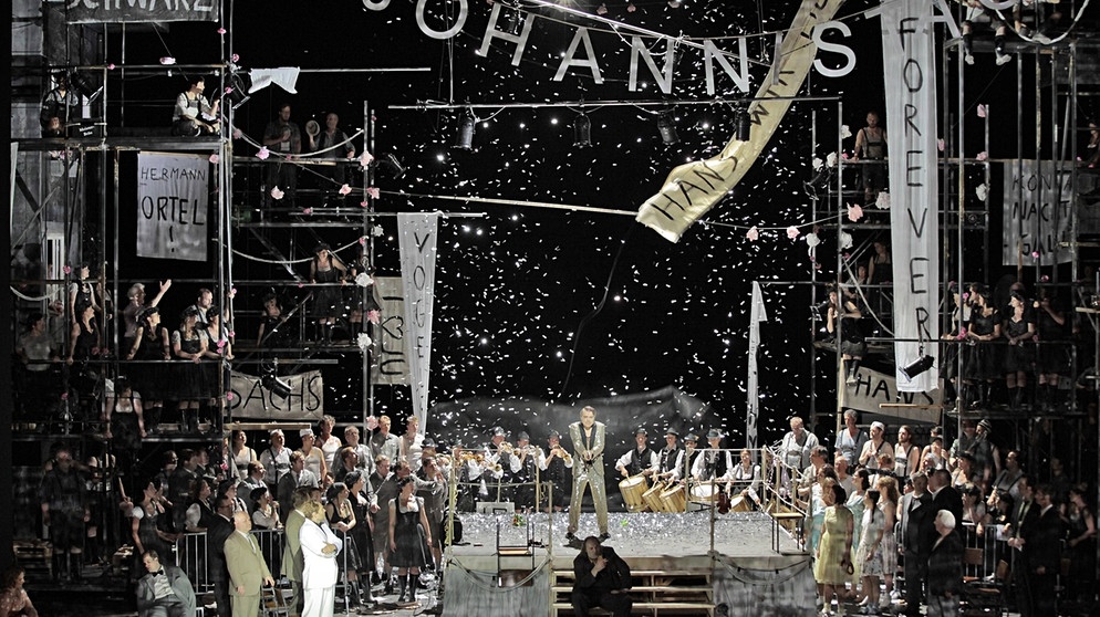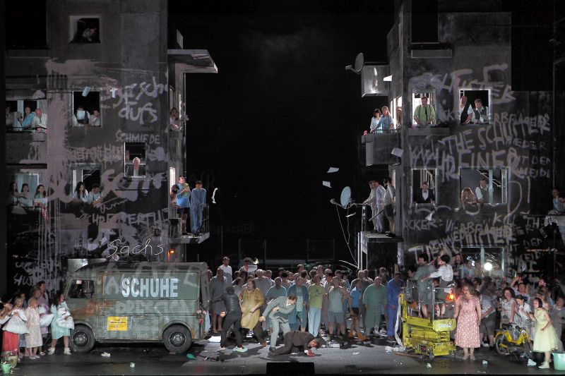 Los Maestros de David Bösch no salen indemnes de la crisis. Nuremberg se transforma en un barrio marginal cuyos zapatos remienda Sachs desde una furgoneta a la que le llueven grafitis. Walther es un músico vagabundo, sin más bienes que guitarra y mochila, que duerme en una colchoneta en el suelo de la furgoneta. Beckmesser se intenta quemar a lo bonzo y finalmente se dispara un tiro en la boca tras dudar si pegárselo a Sachs. Éste no reúne ninguna presencia con autoritas y, curiosamente, el tratamiento de Bösch le acerca mucho en el inicio del tercer acto al Falstaff amargado de Verdi, apoyado por el foso. Hay detalles incomprensibles, como él ansia de fumar de Walter y Eva o el paseo de ambos en una motocicleta de 49cc con la guitarra acuestas. El final, con un Eurovision concurso canoro patrocinado por Pogner en un escenario de andamios, trae otra novedad además del suicidio de Beckmesser: el músico vagabundo no se deja convencer por el parlamento de Sachs sobre las bondades de la tradición y se larga con Eva, dejando a la cofradía de maestros compuestos y sin novia. Se comprenden los sonoros abucheos a los responsables escénicos en medio de más de veinte minutos de ovaciones entusiastas al resto. Munich se puede permitir descolocar al público con sus puestas en escena porque el teatro siempre está a rebosar, pero no es buen ejemplo para otros coliseos sin tal ventaja.