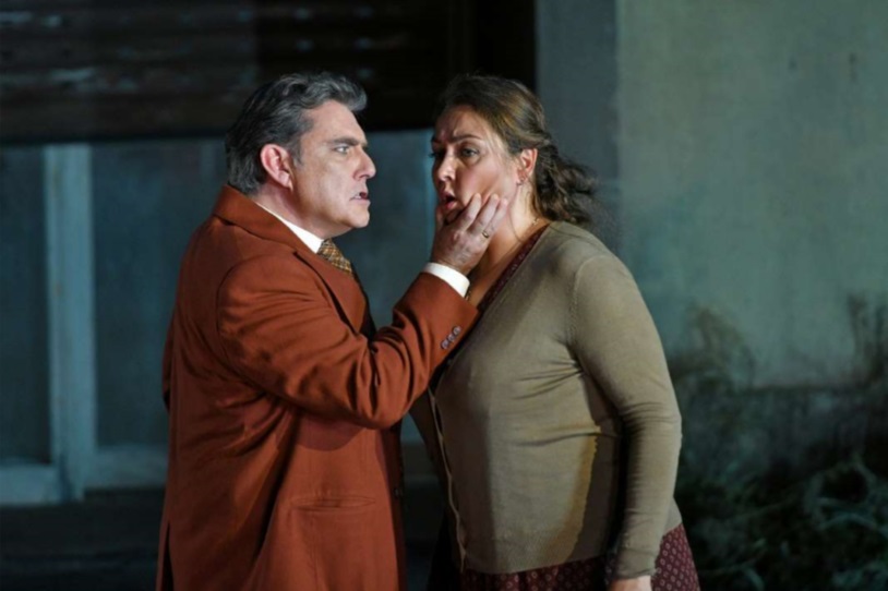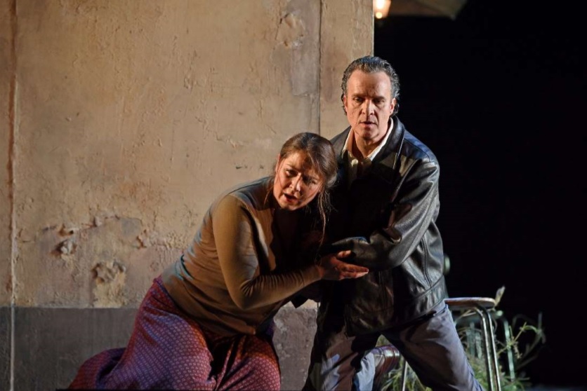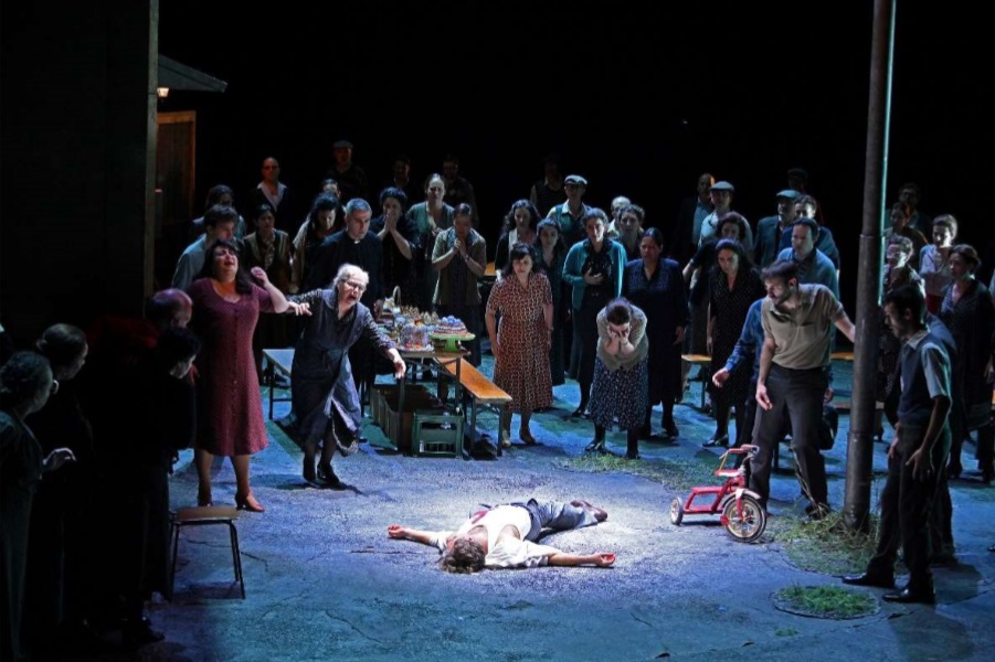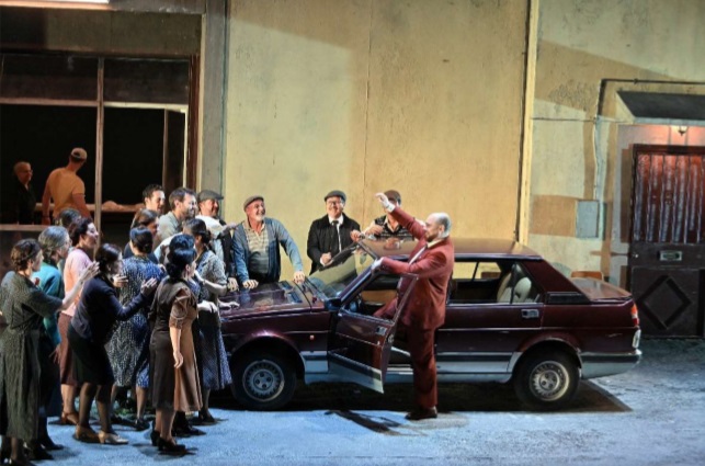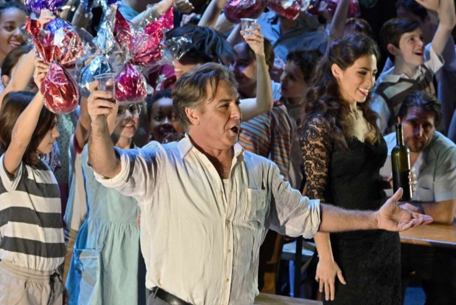 Damiano Michieletto ofrece las dos óperas como continuación una de otra en el tiempo, haciendo que Pagliacci tenga lugar también el día de Pascua. La producción de Cavalleria Rusticana funciona bien, definiendo muy bien a los personajes, desarrollándose la acción en la plaza del pueblo, donde el centro es la Panadería de Mamma Lucía, donde trabaja también el que luego será Silvio, que se encuentra y enamora en el intermedio musical de la ópera a Nedda, ya que la troupe de Canio está en el pueblo pegando carteles. La ópera comienza en el preludio con Turiddu yaciendo en el suelo, que es como terminará también. Está bien hecha la escena de la procesión con una Madonna que toma vida y señala con ira a la excomulgada Santuzza. La acción se traslada a los años 70, con un vestuario adecuado de Carla Teti. La escenografía de Paolo Fantin ofrece un escenario giratorio, con la plaza en un lado y la panadería en el otro. Lo que menos me convence es el ambiente oscuro de la producción, ya que no tiene sentido que salgan de misa y siga todo oscuro. La iluminación de Alessandro Carletti funciona bien.