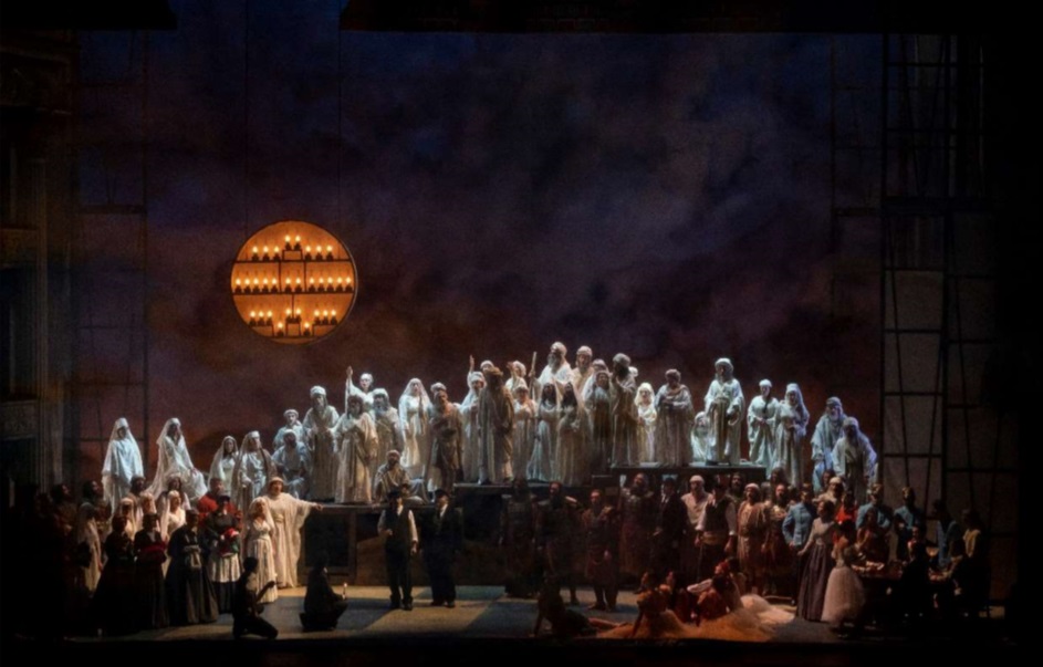 El espectáculo escénico rememora el estreno de la ópera en la Scala de Milán en 1842, cuando Italia no estaba unificada y el norte estaba en poder del Imperio Austriaco. Así pues, se nos ofrece en escena una reproducción del teatro milanés, con palcos a la izquierda del escenario, donde se sientan autoridades austriacas, apareciendo incluso soldados del imperio en escena. El autor de la escenografía es el propio Thaddeus Strassberger y rememora la época a base telas pintadas, todo ello dentro de un gran clasicismo. El vestuario resulta adecuado y de la época histórica, siendo obra de Mattie Ullrich, contando con una correcta iluminación por parte de Mark McCullough.