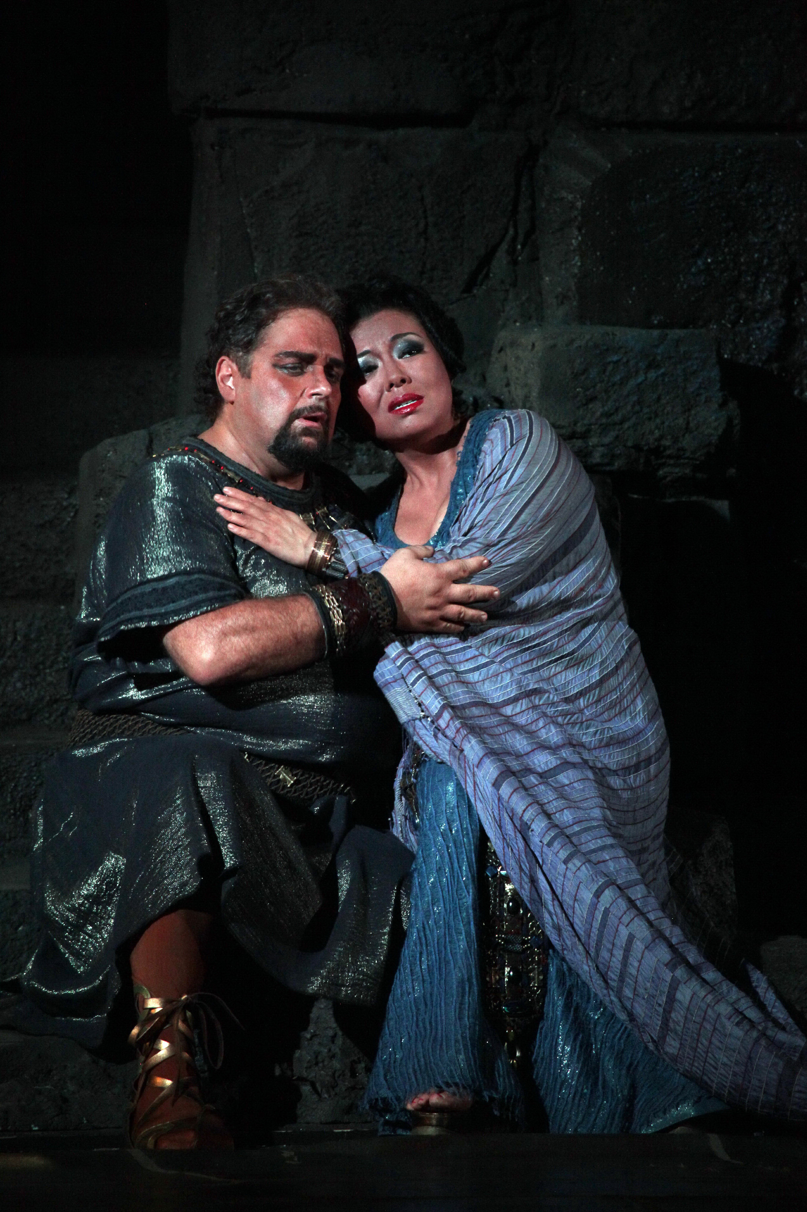 Marco Berti es uno de los intérpretes más frecuentes del personaje de Radamés y en su voz hay mimbres como para justificarlo, aunque a mí no me resulta demasiado convincente. La voz es adecuada, poderosa y bien emitida, pero su canto es demasiado monótono. No hay manera de que recoja la voz en los agudos. En su caso son invariablemente en forte, diga la partitura lo que quiera. En el primer acto le encontré con problemas de fiato, que no volvieron a aparecer durante el resto de la ópera. En tierra de ciegos, el tuerto es rey.