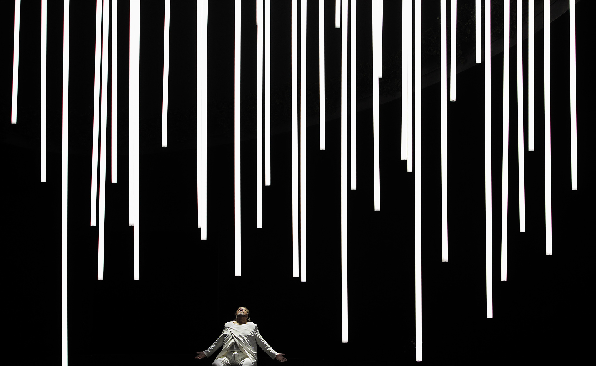 La escenografía, de cuidada iluminación, se basa en una enorme plataforma de ledes que igual son el fondo azulado de una piscina mediterránea que remolino a punto de absorber a los amantes en pleno éxtasis o la orilla de un indeterminado mar o riachuelo. Hay estrellas, luna y mucha sensibilidad sin sensiblerías. El logrado y nocturno segundo acto, envuelto en un cielo estrellado y al que solo falta el “cri-cri-cri” de algún grillo estival, recuerda la magia del célebre Tristan de Ponelle, el del árbol en el segundo acto. Hacía tiempo que en Bayreuth no se veía un trabajo tan quieto y cuidado. Schwab no tiene miedo ni al silencio ni al estatismo escénico que tanto pide la partitura. Y este es, precisamente, otro de los aciertos de este bienvenido montaje: escucha la música en lugar de luchar contra ella.