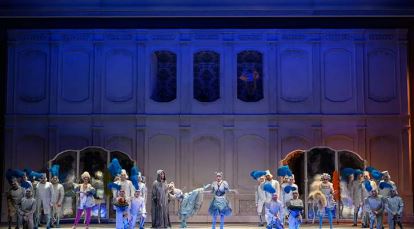 El Liceu nos ofrece para esta nueva ocasión de Cenerentola la producción de Emma Dante, que se estrenó en Roma en el año 2016, habiendo viajado posteriormente por algunas ciudades italianas. La producción ofrece prácticamente una escenografía única, cerrando la parte posterior del palco escénico con una gran pared con puertas elevadas, por donde se asoman a veces figurantes.