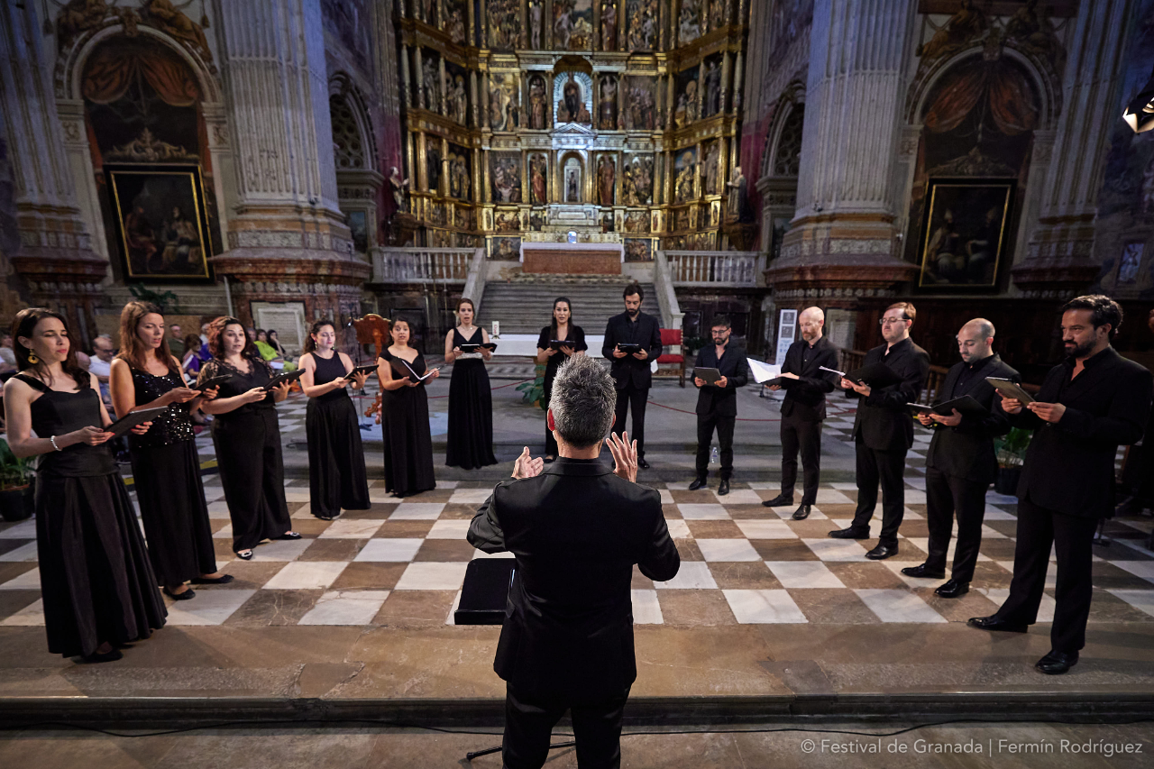 Hablamos de estos dos nuevos conciertos, tan distintos entre sí, del Festival granadino. Por la mañana, en el bello marco de San Jerónimo, bajo el maravilloso altar mayor, escuchamos un concierto polifónico presidido por la figura de Sebastián Vivanco (1551-1622), paisano y compañero del más célebre y reconocido Tomás Luis de Victoria (1548-1611), pero equiparable a él en conocimiento, destreza musical y técnica, capaz de construir páginas contrapuntísticas del más alto valor.