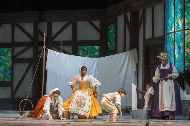La puesta en escena, que proviene del Teatro japonés del Giglio Showa, es muy tradicional y acomodaticia, con decorados y trajes de época, que divide el espacio en dos mitades, pero funciona hasta el tercer acto, con todo el escenario a la vista. Ninguna originalidad en el cuadro nocturno del Parque de Windsor, donde se acumuló, algo atropelladamente, todo el mundo. Y discutibles algunos efectos, sobre todo, el del ridículo riachuelo en el que es arrojado el panzudo. Arturo Reverter