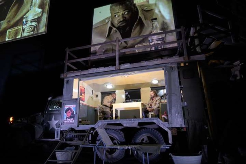 Así llegamos a la escena final, donde nos llevan a la caja de un camión, donde se coloca Don Carlo. Finalmente, aparecerá Leonora, la ermitaña, que va vestida con transparencias como hacen todos los ermitaños de este mundo, siendo al parecer acuchillada fuera de escena por su hermano, de quien no estoy seguro si muere, ya que la pantalla nos lo enseña siempre vivo y fumando. El último gran golpe de genialidad de Frank Castorf viene en los minutos finales, en los que las pantallas nos presentan una visión de Broadway por la noche. Nada más apropiado para terminar esta ópera.