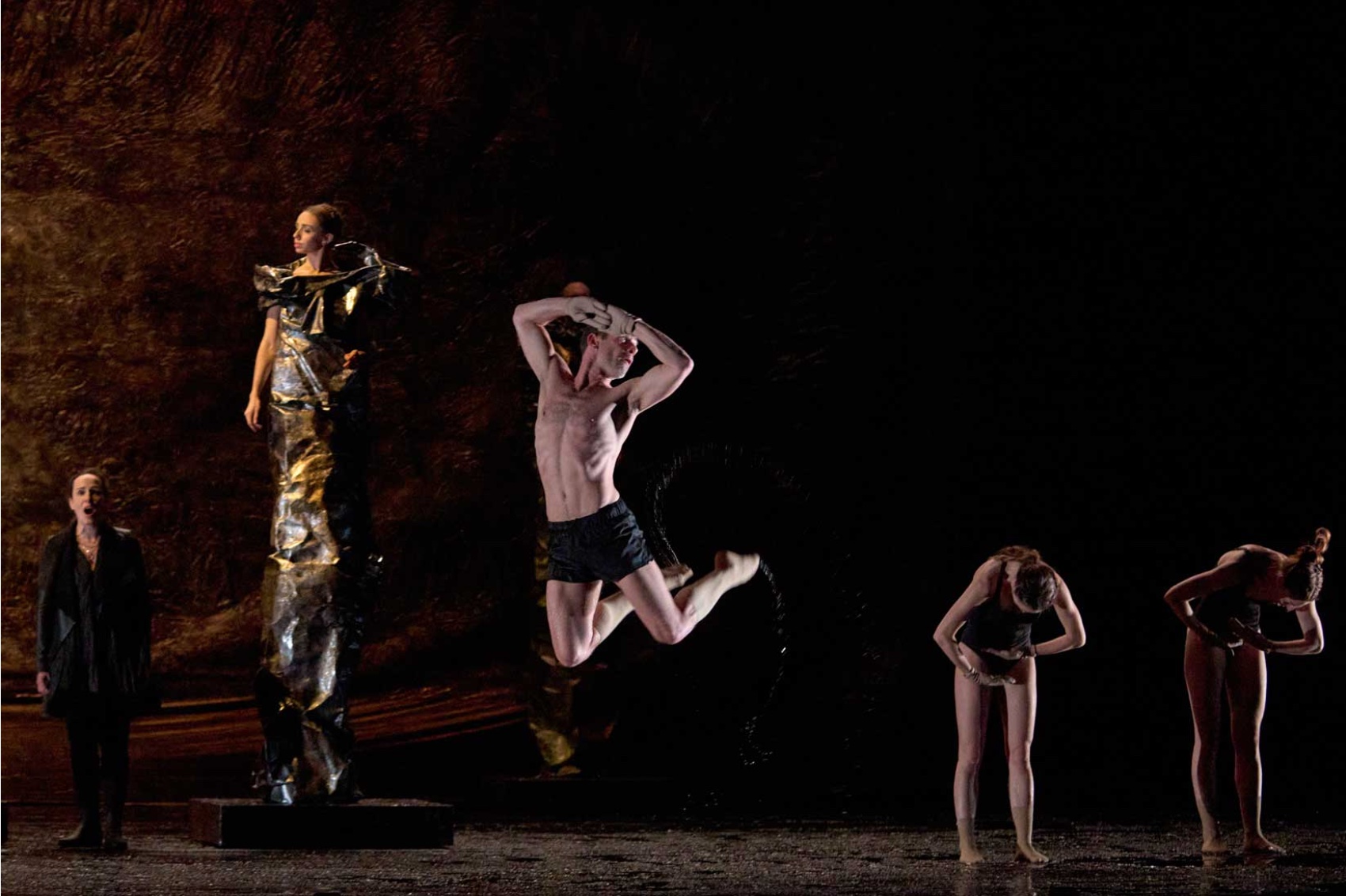 En esta producción podemos decir que la danza es la gran protagonista, debiéndose a Blanca Li, coreógrafa de profesión y actual directora de los Teatros del Canal de Madrid. Ofrece un escenario, en el que a la izquierda se sitúa la orquesta, dejando un amplio espacio para las evoluciones de los bailarines, teniendo toda la parte delantera con agua para facilitar los desplazamientos de los danzantes. Los cantantes principales están prácticamente inmóviles, colocados en una especie de columnas, que son movidas por extras. A mí me parece que esto hace perder dramatismo a la trama, ya que el protagonismo corresponde casi en su totalidad a la danza, lo que a mi juicio muy personal resulta un tanto excesivo.
