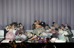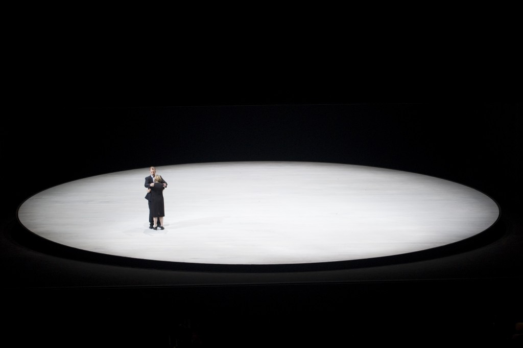 En este reducido espacio Barrie Kosky hace un trabajo estupendo de dirección de escena, moviendo estupendamente a los personajes y al coro, utilizando los pasillos alrededor del foso e incluso éste mismo, donde se sitúa el coro para la escena final. El trabajo de actores es muy bueno, resultado muy divertido el trío de brujas, que aquí llevan barba y son brujos. El único punto que no me gustó es tener a la Reina Dido en escena, después de cantar el maravilloso “Remember Me”, con sollozos continuos, mientras el coro y la orquesta dan fin a la partitura. Sobran todos esos sollozos, cuando la música es sublime. Impactante el final, al ir abandonando el coro y los músicos poco a poco el foso para terminar saliendo también el maestro, quedando el violín como único hilo de música.
