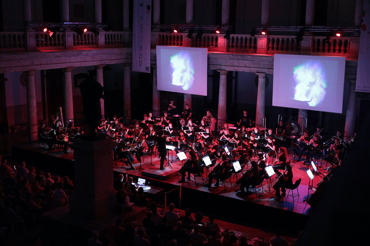 Daba gusto ver tocar a los radiantes músicos de la Filharmònica de la Universitat de València enfrascados en un programa atractivo y cargado de virtuosismo, exigencias y buena música. También producía orgullo y esperanza de futuro ver a sus colegas del patio de butacas aplaudir y bravear con entusiasmo solidario cada una de las cuatro obras de este programa oportuno y pertinente. Hubo silencio, respeto a la música y mucho mucho calor, superior incluso al de la tórrida noche estival. “Juventud, divino tesoro”, que escribió Rubén Darío.