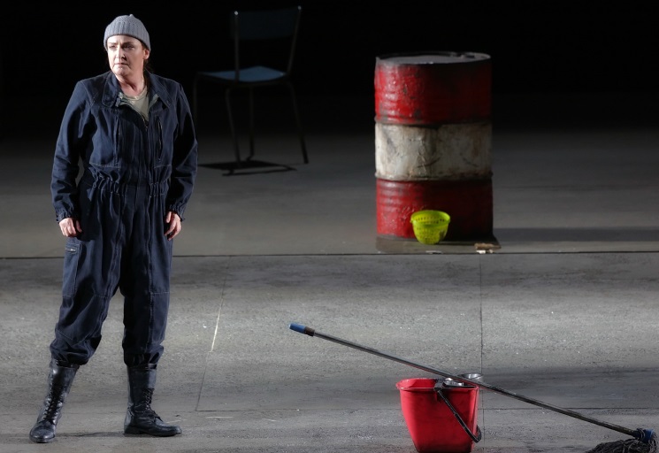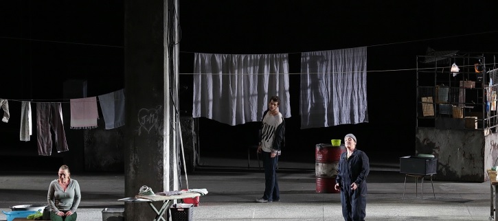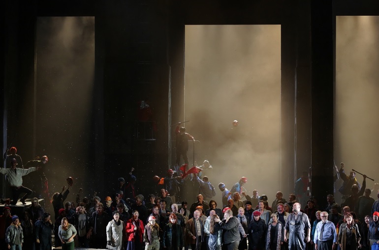 La producción de la británica Deborah Warner trae la acción a tiempos más modernos y ofrece una escenografía única, lo que hace que la iluminación original de Jean Kalman tome un importante protagonismo, habiendo sido llevada adelante en esta ocasión por Valerio Tiberi. La citada escenografía, como el vestuario, es obra de Chloe Obolensky y ofrece una escena con altos muros representando la prisión. Los muros se abrirán en la escena final para dar paso al pueblo y prisioneros. El vestuario resulta adecuado para la época en que la producción desarrolla la trama. La dirección de escena resulta correcta, sin ofrecer nada espectacular. En resumen, es una producción que no molesta y sirve perfectamente para narrar la trama. Un alivio después del Rigoletto del día anterior en Munich.