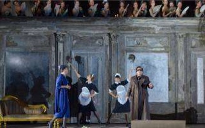 Así pues, se ha repuesto la producción del americano David Alden, cuyo trabajo me ha resultado interesante y atractivo a ratos, aunque hay aspectos bastante discutibles. La escenografía de Giles Cadle ofrece un escenario único para los cinco actos de la ópera, con un gran espacio en el centro del escenario, cerrado por paredes laterales, así como en el fondo. Son elementos de atrezzo los que configuran las distintas escenas, permitiendo rápidos cambios, lo que no deja de tener importancia en una ópera como Hugonotes. El vestuario de Constance Hoffman responde a tiempos más bien modernos, resultando elegante y colorista. Buena también la iluminación de Adam Silverman.