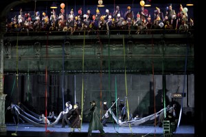 La dirección escénica de David Alden se centra en los personajes, al seguir colocando al coro en una galería elevada, a forma de coro de tragedia griega. Los personajes están bien definidos y la historia se narra de manera efectiva. La escena mejor conseguida es la de la regata, donde David Alden demuestra lo que se puede hace con imaginación en un escenario. Sus góndolas merecían un aplauso, porque no eran sino fruto de su imaginación.
