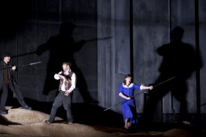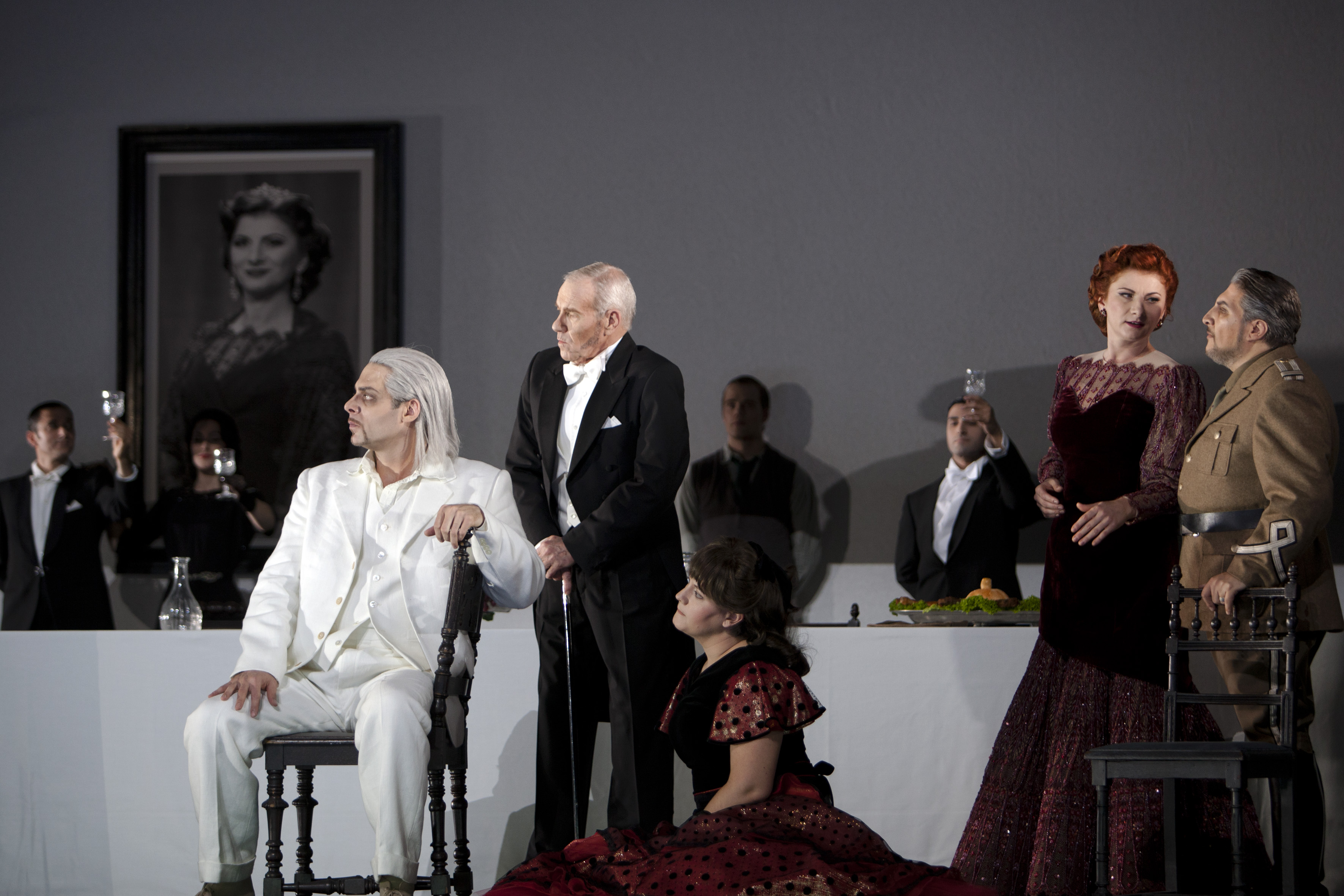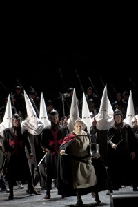 Hamburgo ha programado esta atípica trilogía verdiana con nuevas producciones, que ha encargado al americano David Alden, uno de los directores de escena más rompedores de la actualidad. La producción que nos ha ofrecido en este caso es un tanto extraña. La ópera arranca no ya en la Plaza de San Ambrosio en Milán, sino en la casa de Arvino, donde se celebra una fiesta de reconciliación entre los hermanos (Arvino y Pagano) y que tiene lugar en los años 30 aproximadamente. Teniendo en cuenta la ambientación, uno podía creer que la marcha de los lombardos a la primera cruzada iba a ser sustituida por la marcha de las tropas de Mussolini a Abisinia, pero en el segundo acto nos encontramos con el coro vestido de cruzados, acompañados de gentes con capirotes y cruces. Supongo que lo que Alden ha querido significar es el horror de las guerras de religión en cualquier tiempo. La escenografía de Charles Edwards no es muy atractiva, siendo lo más conseguido el acto I en la mansión de Arvino. De ahí pasamos a Oriente, siendo la cueva del ahora ermitaño Pagano, una especie de capilla o gran confesionario, mientras que los últimos actos se desarrollan en un suelo arenoso. El vestuario de Brigitte Reiffenstuel no tiene mucho atractivo. Correcta la iluminación de Adam Silverman.