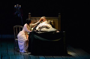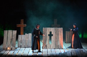 Para la ocasión el Festival Verdi ha ofrecido una nueva producción del cineasta italiano Leo Muscato, cuyo resultado se me antoja un tanto decepcionante. Estamos ante una producción minimalista, cuya escenografía (Federica Parolini) consiste en una plataforma inclinada, con unos paneles de cierre en la parte de atrás. Para las distintas escenas se ofrecen algunos elementos de atrezzo (un sillón, una cama, unos árboles y unas supuestas tumbas), que cumplen con el objetivo de hacer una producción escénica barata. La acción se trae a la época de composición de la ópera y el vestuario (Silvia Aymonino) resulta eficaz más que brillante. Buena la iluminación de Alessandro Verazzi.