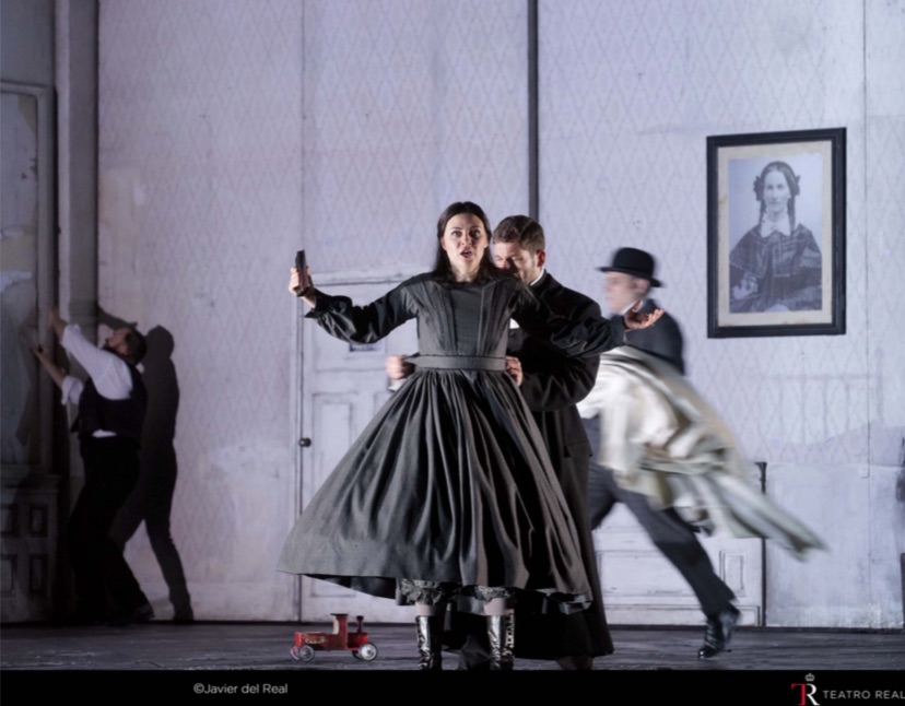 Como elementos escénicos y escenográficos, apenas una pequeña plataforma fija detrás de la orquesta constituida por una ancha escalera que recorre la escena de derecha a izquierda y culmina en un escueto trono. Sobre ella, la plataforma elevada del coro. Y a la izquierda de la orquesta, un voluminoso cubo de madera que podría haber incidido en una sensible mejora de la (mala)acústica del Auditori del Palau de les Arts. Bastaron estos mínimos recursos, combinados con un vestuario sencillo pero de certera caracterización, para establecer una clara narración escénica en la que aparecen perfectamente definidos los perfiles psicológicos y vitales de los seis personajes que la protagonizan.