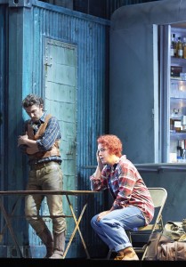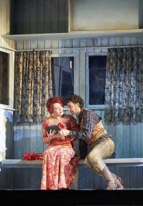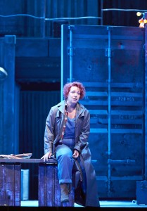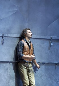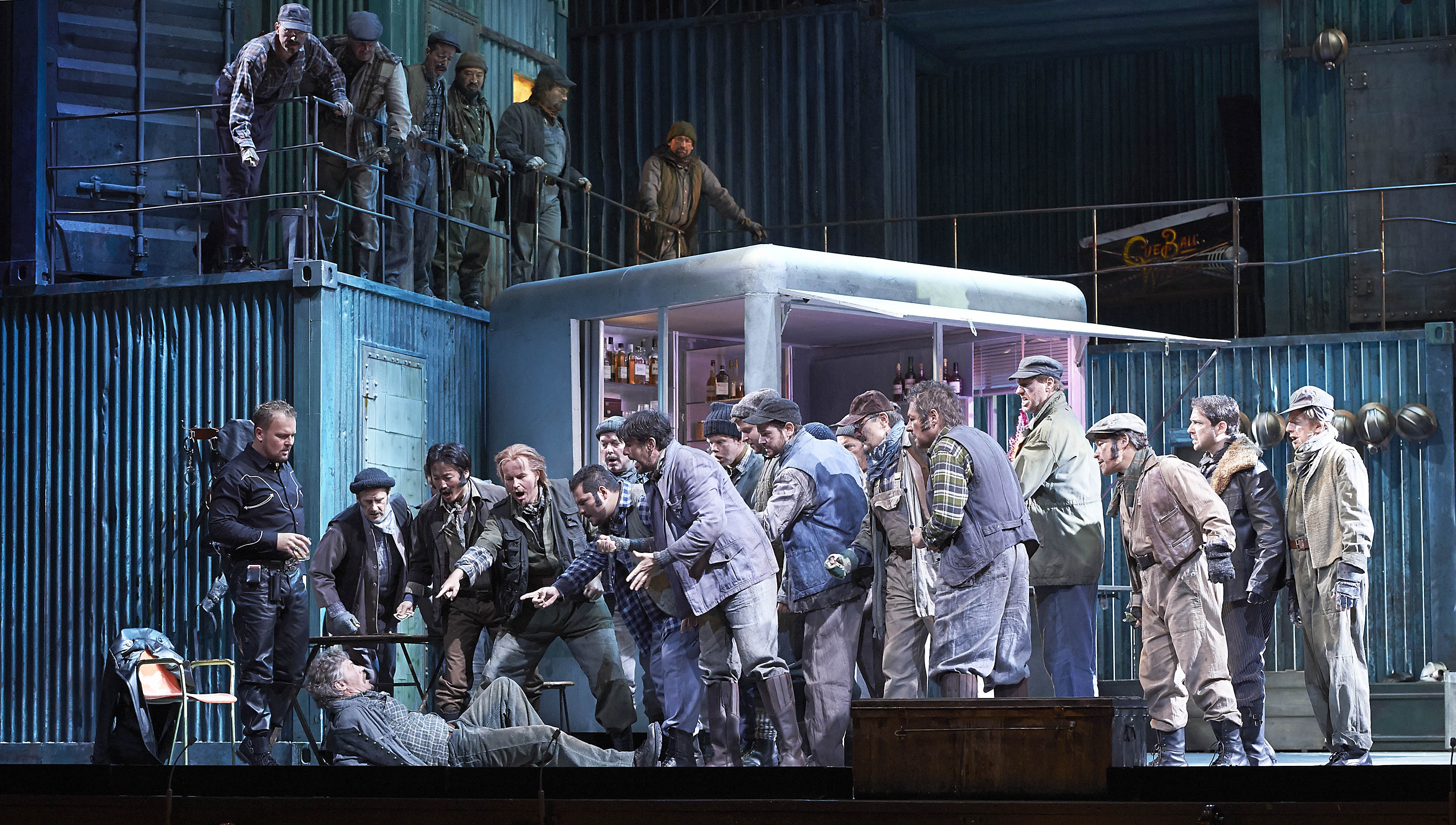 Se trata, como digo, de una nueva producción, que lleva la firma de Marco arturo Marelli, que es uno de los directores de escena, cuyas producciones siempre se caracterizan por el buen gusto. En esta ocasión Marelli intenta salir del ambiente del Far West, que tan presente está en la obra de David Belasco como en el libreto de la ópera, en los que tanto metía la mano Giacomo Puccini. Por mucho que se quiera salir del ambiente un tanto kitsch del Lejano Oeste, los intentos no suelen llegar a buen puerto, ya que el libreto está plagado de referencias al mismo. Marco Arturo Marelli mueve la acción a tiempos más modernos, alrededor de mediados del siglo pasado, situándola en un poblado minero, en el que los obreros acuden en el primer acto al Bar, que no exactamente La Polka del libreto, sino una especie de remolque de los que abundan en tantos lugares para la venta de salchichas. La cabaña de Minnie viene a ser una vivienda-remolque, en la que únicamente las estufas eléctricas denuncian que no estamos en el Far West. Finalmente, el último acto se desarrolla en el aparcadero del ferrocarril del poblado, rodeado de contenedores metálicos. La cosa funciona razonablemente bien y no chirría sino levemente. Esta adecuada escenografía es obra de Marco Arturo Marelli, como lo es también la labor de iluminación. El vestuario de Dagmar Niefind resulta adecuado, aunque no sale muy bien parada Minnie con las ideas del figurinista. Un tanto infantil el detalle final de hacer que Minnie y Dick Johnson abandonen el poblado en la barquilla de un globo con los colores del arco iris, detalle más adecuado para una ópera bufa, como lo hiciera Emilio Sagi en el Barbero de Sevilla del Teatro Real.