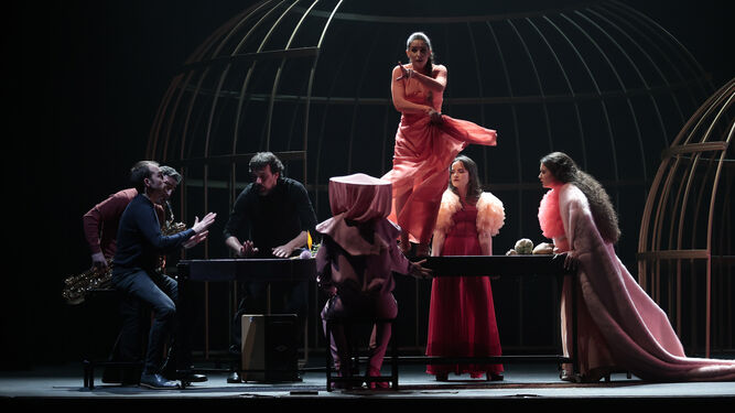 Esto en cuanto al magma conceptual sobre el que se eleva esta ópera de cámara compuesta por Manuel Busto. Busto conoce en profundidad los códigos de la ópera y los del flamenco y ha sabido en su partitura combinarlos y jugar con los estilemas propios de cada ámbito. Desde el foso, con el espléndido Trío Arbós, hecho a este tipo de experimentaciones estilísticas, junto al Proyecto Lorca y las percusiones espectaculares de Agustín Diassera, una serie de oleadas sonoras establecían un tejido magmático, telúrico, en el que los juegos tímbricos y el continuo ir y venir de la rítmica irregular y la polirritmia se entrelazaban con armonías más contemporáneas.