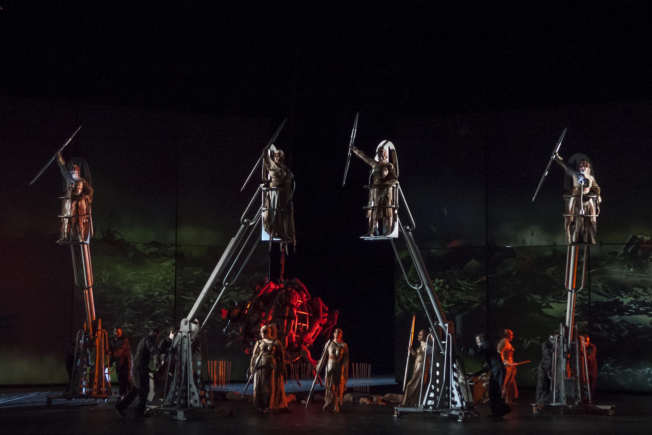 La dirección escénica original se debe a Carlus Padrissa y sus ideas resultan menos imaginativas que en otras entregas del Anillo del Nibelungo. De nuevo estamos en un escenario desnudo con una pantalla al fondo, en la que se proyecta un gran árbol en el primer acto, concibiendo Padrissa el encuentro de los gemelos welsungos como el de Homo Sapiens y Neardental, presentando a la sometida Sieglinde moviéndose como un cuadrúpedo hasta que la llegada de la primavera hace que Siegmund la levante, volviéndola a su posición originaria, puesto que ella también es Sapiens. En esta escena los detalles están bien cuidados, pero no se le saca demasiado partido al fresno ni a las proyecciones. En el segundo acto, volvemos a las conocidas grúas telescópicas y sus cestas, que caracterizan especialmente a esta Tetralogía. El diálogo de cestas entre Wotan y Fricka me sigue sin convencer y el monólogo de Wotan, utilizando cesta y grúa en forma de diván, resulta más convincente, haciendo buen uso de proyecciones del robo del oro y lo acontecido en Das Rheingold. En el anuncio de la muerte Brünnhilde sale en una carra llena de chirimbolos metálicos, que en la batalla resultan ser un montón de piezas que se elevan colgadas, incluidas algunos figurantes, en una exhibición de coste sin mayor sentido y significado. La aparición de Wotan en su cesta-grúa en la batalla resulta una especie de anticlímax, seguramente pensado en el efecto que podría causar en DVD. La Cabalgada nos vuelve a mostrar 4 grúas para otras tantas valquirias en un movimiento en escena poco convincente. El fuego mágico se consigue con una plataforma sostenida por “fureros” agachados, que van encendiendo sus antorchas, lo que puede resultar atractivo, pero le hace perder mucho de su sentido mágico. En resumen, una producción imaginativa, con ideas más o menos originales, pero que resulta un tanto “deja vu”.