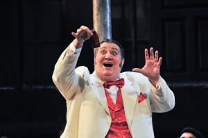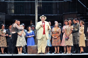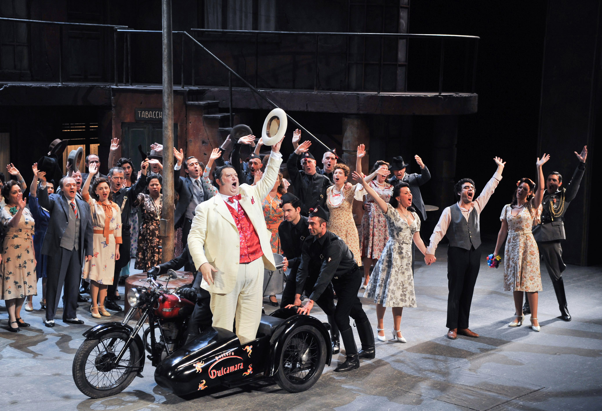 Por si hay todavía alguien que no conoce la producción, les diré que la tropa de Belcore se convierte en “camisas negras”, en un escenario único en forma de patio vecindad. La dirección escénica sigue funcionando francamente bien, llena de detalles del agrado del público, como la llegada de Dulcamara en un sidecar, la gente asomada a las ventanas en “O, rustici”, el divertido banquete de bodas, que abre el segundo acto, acompañado de música napolitana a cargo de Beniamino Gigli, terminando con el divertido paseo de Dulcamara y Moretto por el patio de butacas, repartiendo “elixir”, mientras el “León Salvador” de mi niñez canta de nuevo las estrofas de su despedida. Escenografía muy adecuada, obra de Marcelo Grande, autor también del diseño de vestuario. Buena la iluminación de Quico Gutiérrez. La dirección escénica en esta ocasión la ha llevado adelante José Antonio Gutiérrez. A juzgar por la reacción del público, todo parece indicar que esta producción sigue teniendo todavía cuerda para rato.