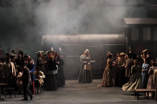 La producción no deja de ser un capricho de Davide Livermore, funcionando mejor los actos I y III que el segundo y el acto final. En el primer acto estamos en una estación de tren con su locomotora, en la que huirán los jóvenes amantes. El acto III viene dominado por una gran sala con rejas y la aparición de un gran barco al fondo, a donde se subirán los amantes para su traslado al nuevo mundo. Lo menos convincente resulta el acto II, que redesarrolla en una auténtica casa de prostitución, lo que casa bastante mal con el texto. Lo menos conseguido es el último acto, en el que volvemos a la escena inicial, en una especie de hospital y todo choca con el libreto, ya que deberíamos estar en el desierto con su falta de agua y aquello no tiene mucho sentido. La presencia casi permanente de un actor como el anciano Des Grieux resulta un tanto cargante y nada aporta, ya que con su presencia en la escena inicial era suficiente mi parecer.