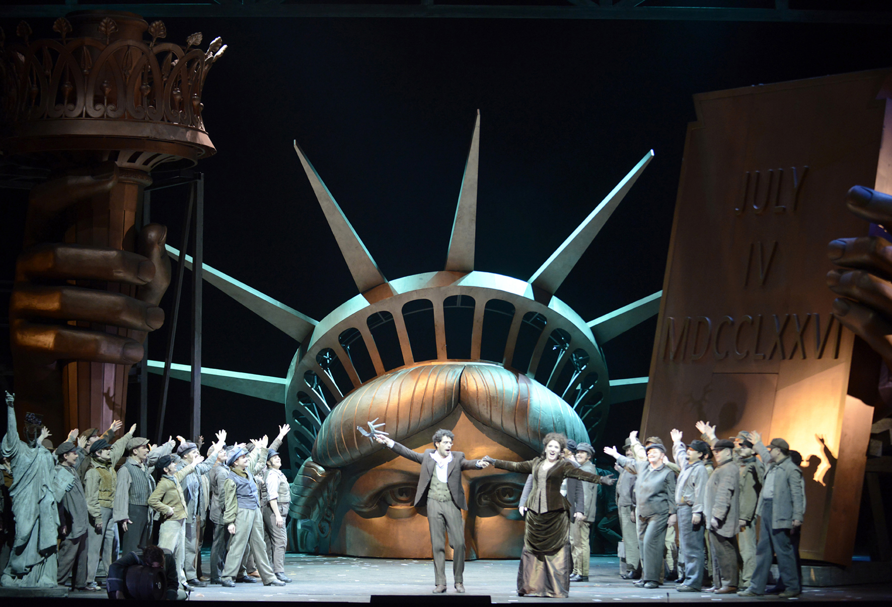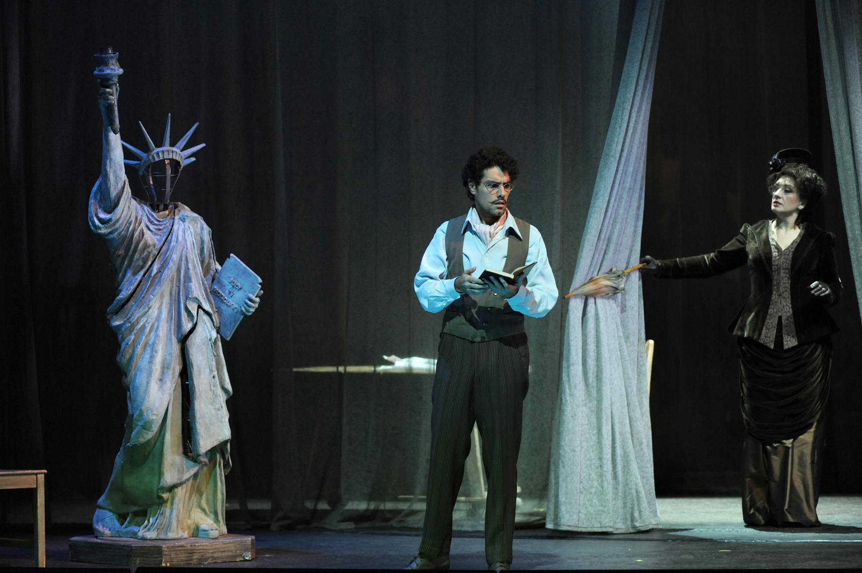 Uno de los motivos del fracaso de esta representación estriba precisamente en la producción de Stefan Herheim, quien, al ofrecer su propia trama, acaba eliminando cualquier atisbo de emoción. El motivo central de la producción es el ansia de libertad de los protagonistas, que viene representada por la celebérrima Estatua de la Libertad de Nueva York, que se podía visitar en París antes de que Francia hiciera donación de la estatua a Estados Unidos en 1886. El arranque de la ópera no es, pues, la estación de postas de Arrás, sino los talleres de construcción de la Estatua de la Libertad, donde Des Grieux parece ser su autor y son muchos los visitantes, entre ellos Manón. La historia que narra Herheim poco tiene que ver con la del Abate Prevost o la de Puccini, puesto que parece que América es un sueño de libertad para los protagonistas, cuando realmente en la novela y en la ópera, Manón – y con ella des Grieux – son deportados en barco y no van en un crucero de placer, como pretende hacernos creer el señor Herheim. El noruego no tiene mejor idea que añadir un personaje más a la narración, que no es otro que Giacomo Puccini, quien dirige a los protagonistas y les señala los cambios que introduce en la novela de Prevost, que ellos casi siempre llevan en sus mano y parecen recitar. El problema es que Puccini interviene en la escena y así el Sola, perduta, abandonata no lo canta Manón íntimamente, sino que lo canta a Puccini en su despacho, muriendo en sus brazos. ¿Dónde? Se supone que en América, pero ni rastro de desierto de Luisiana. No hay emoción en ningún momento, porque todo consiste en una interpretación con Puccini de director de escena.