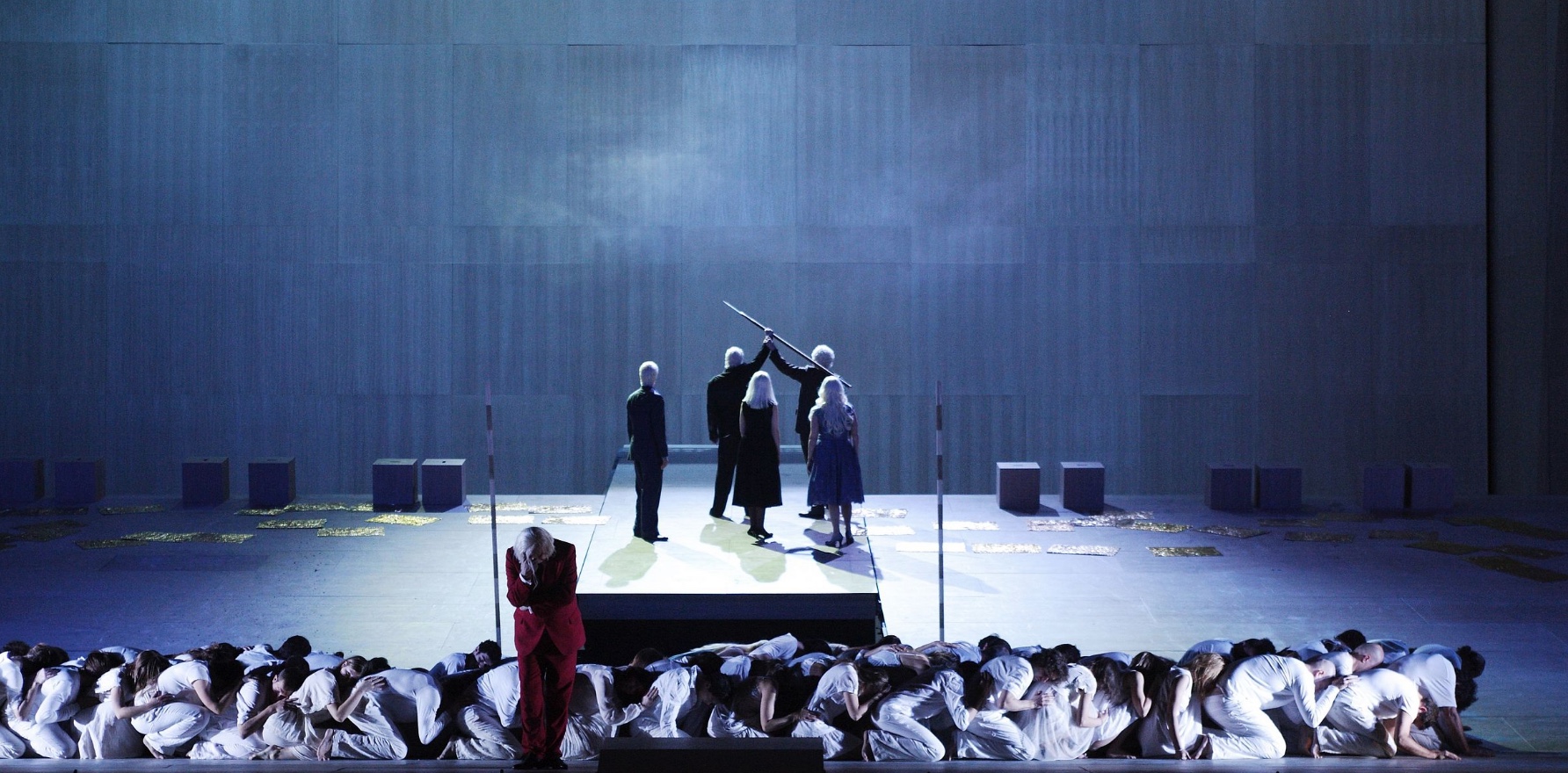 La producción es minimalista, realmente casi únicamente una caja escénica similar a la que se coloca para los conciertos y que ayuda a proyectar las voces, a la que apenas se añaden elementos móviles, si se exceptúa la caja acorazada del tesoro. Casi una centena de figurantes se encargan de dar vida a la acción. Aparecen en el escenario antes de empezar la ópera, se desnudan, se pintan de azul y “escenifican” las turbulencias del río en el que las tres ondinas guardan el secreto wagneriano. Serán también quienes eleven a Erda en su aparición, como si fuesen raíces, o simularán el pobrísimo ascenso al Valhalla que no acompaña en nada a la grandiosa música de la partitura en una escena en la que los dioses permanecen estáticos.