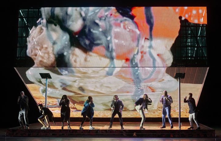 La arquitectura y el despliegue tecnológico y colorista del pabellón de Arabia Saudí de la Expo 2020 de Dubái inspiró a Calixto Bieito para esta escenografía de Giulio Cesare de Georg Friedrich Händel, coproducida entre el Gran Teatre del Liceu y la Ópera Nacional Holandesa, que no alcanza la grandiosidad y excelencia del espacio arquitectónico y de sus de sus proyecciones virtuales, pero consigue algunas escenas de gran plasticidad cuando se ofrecen las proyecciones videográficas de Sarah Derendinger sobre su superficie o cuando algunos personajes caminan sobre la estructura.