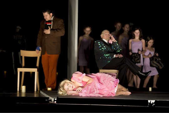 La dirección escénica de Benedict Andrews es espectacular. Trae la acción a tiempos modernos, pero es muy respetuoso con la trama y demuestra un profundo conocimiento de la partitura. Es ni más ni menos que un estupendo trabajo al servicio de la música. La dirección de actores es espectacular, tanto con los solistas como con el grupo de figurantes, tramoyistas, niños y coro. Un auténtico ejemplo de lo que debe ser una producción escénica moderna, cuyo coste tiene que haber resultado más bien bajo, pero que ha tenido que exigir numerosos ensayos para que todo haya salido tan cuidado en escena. El único punto debatible del espectáculo es el de haber ofrecido la ópera sin interrupción, cuando admite perfectamente un intermedio.