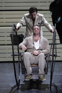 Cualquiera que haya asistido a un ensayo musical de una ópera en un teatro sabe que tiene lugar en una sala, en la que es frecuente ver al coro ocupando unas gradas semicirculares, mientras que los solistas ocupan la parte frontal, van vestidos de calle y acostumbran a no dar los agudos de sus partituras. Esto es exactamente lo que ocurre con esta producción. El único momento en que el coro deja las gradas y está en el escenario es en el segundo acto, mientras Rigoletto canta lo de cortigiani, vil razza damnata. No hay más elementos de escena en toda la ópera que una silla de ruedas, que lleva con él Sparafucile sin que se sepa para qué, y que es donde matan a Gilda, vestida de novia y – oh, sorpresa – su padre no la reconoce y eso que no está metida en un saco. Aparte de esto en la vendetta aparece un enorme caballo de bronce que traen los figurantes y que me temo que se equivocaron en la ruta del circo. Como parece estar de moda en Munich, tampoco Gilda se muere en escena, sino que se va, auque que con el vestido muy manchado, porque a Maddalena se la va la mano echándole no pintura roja, sino negra.